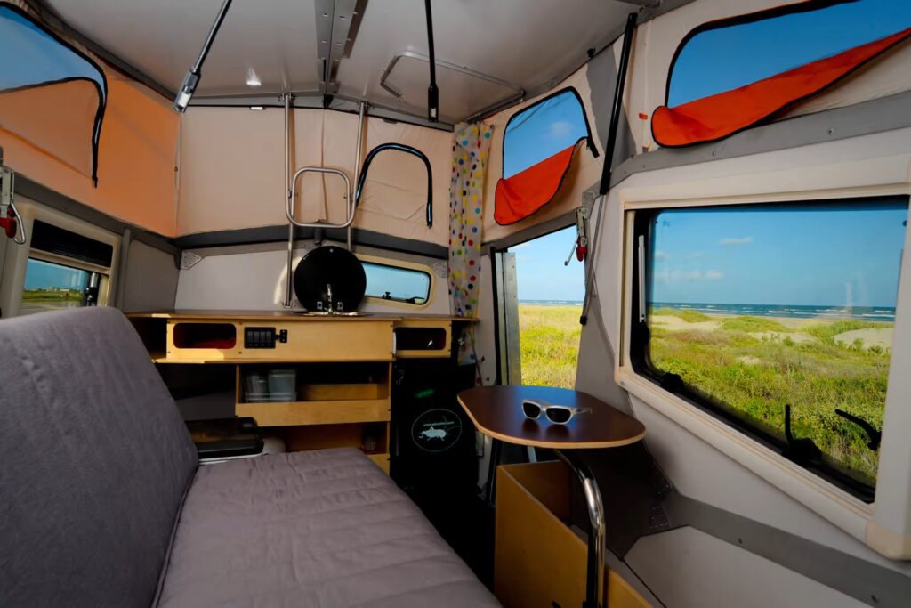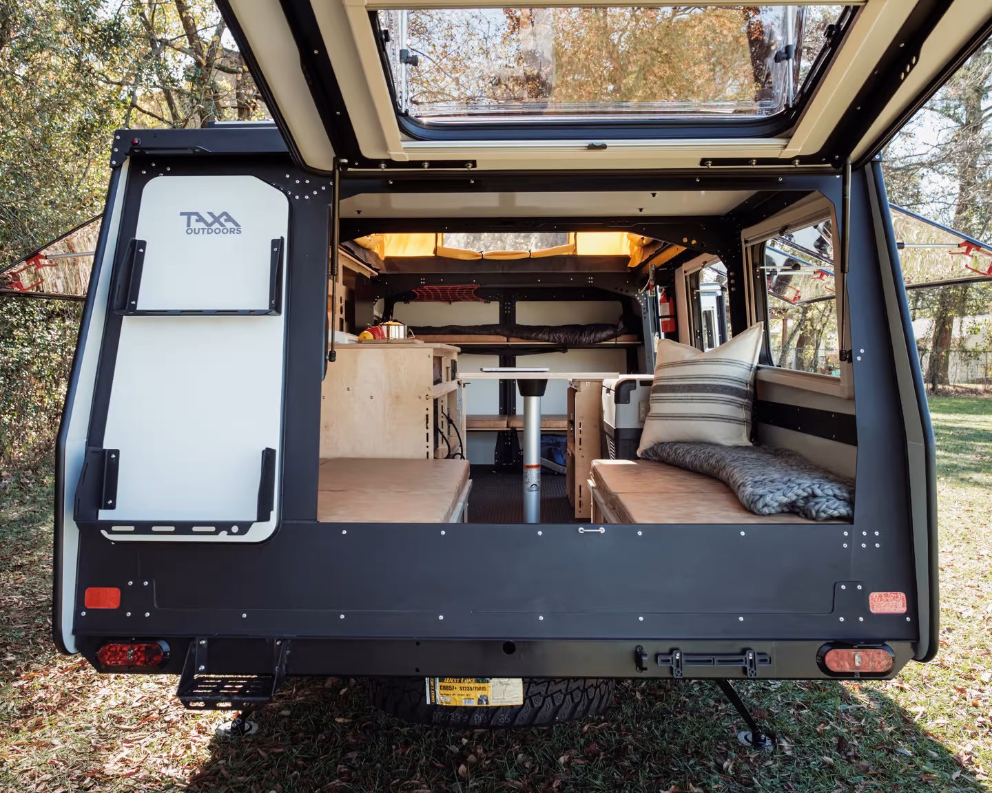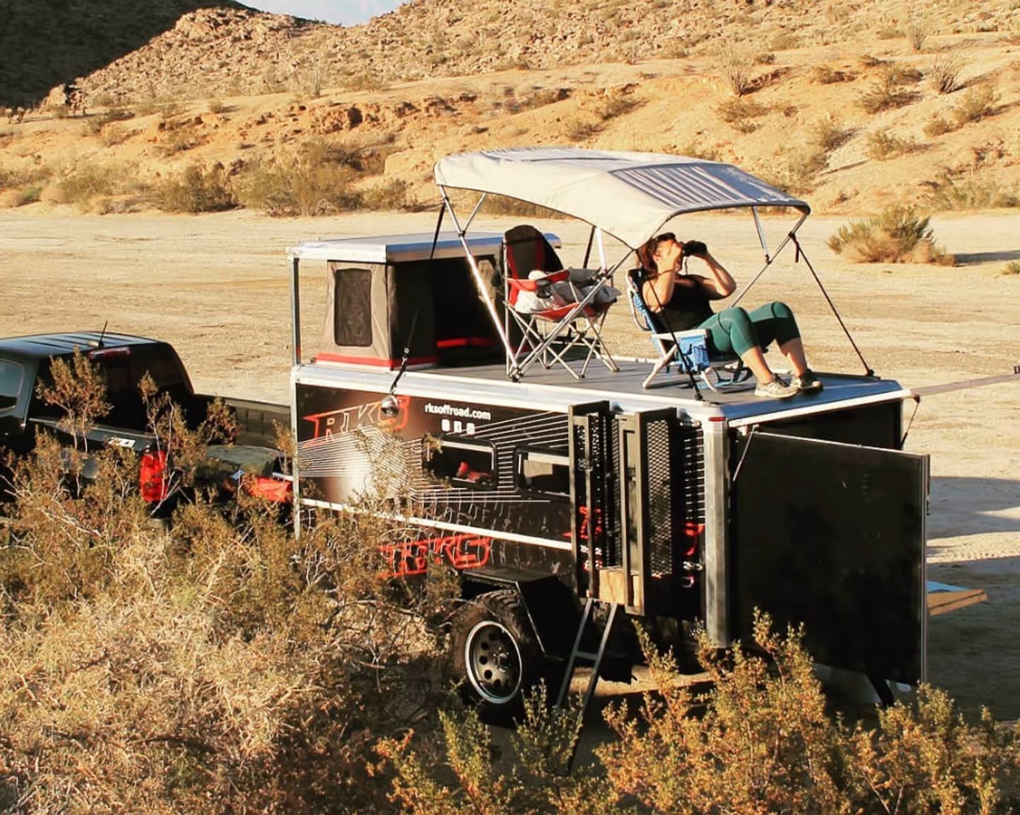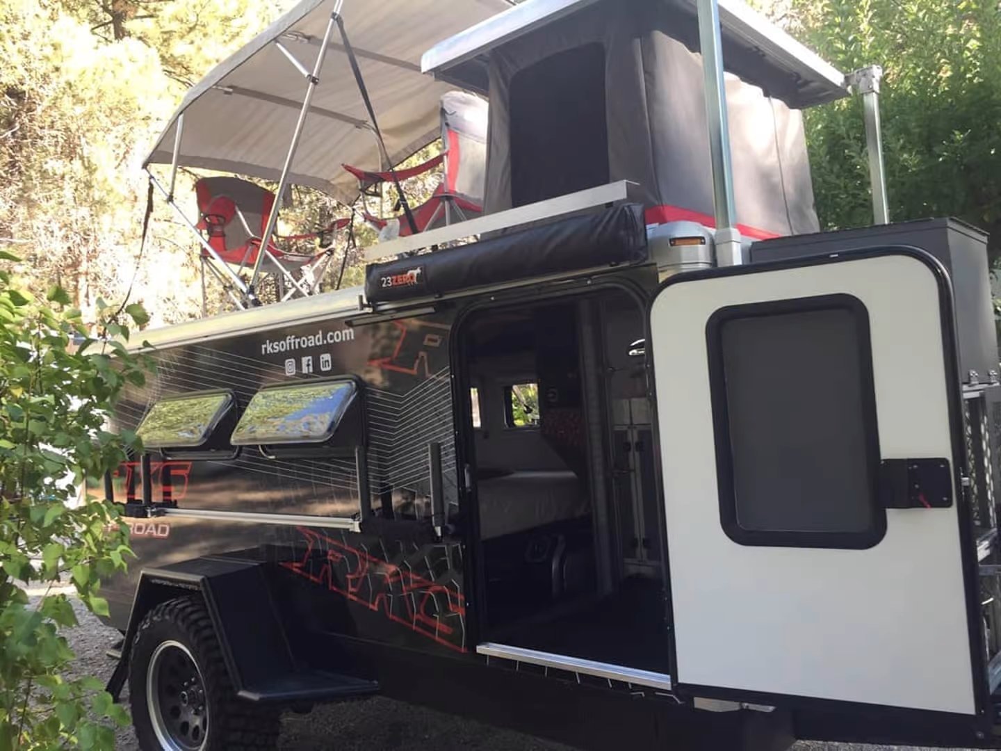 The roof of the short, sturdy Purpose Trailer from California’s RKS Off-Road is unlike any other you’re likely to see at the campground with a pop-up that resembles a chimney and a bimini-topped party deck. In fact, it can support up to 1,000 lb (454 kg), allowing a group of friends to chill out during the day for better views, with a pair staying overnight to camp in the deployable tent. The interior is designed in a hybrid caravan/teardrop style, with standing height where you need it and lying height where you don’t.