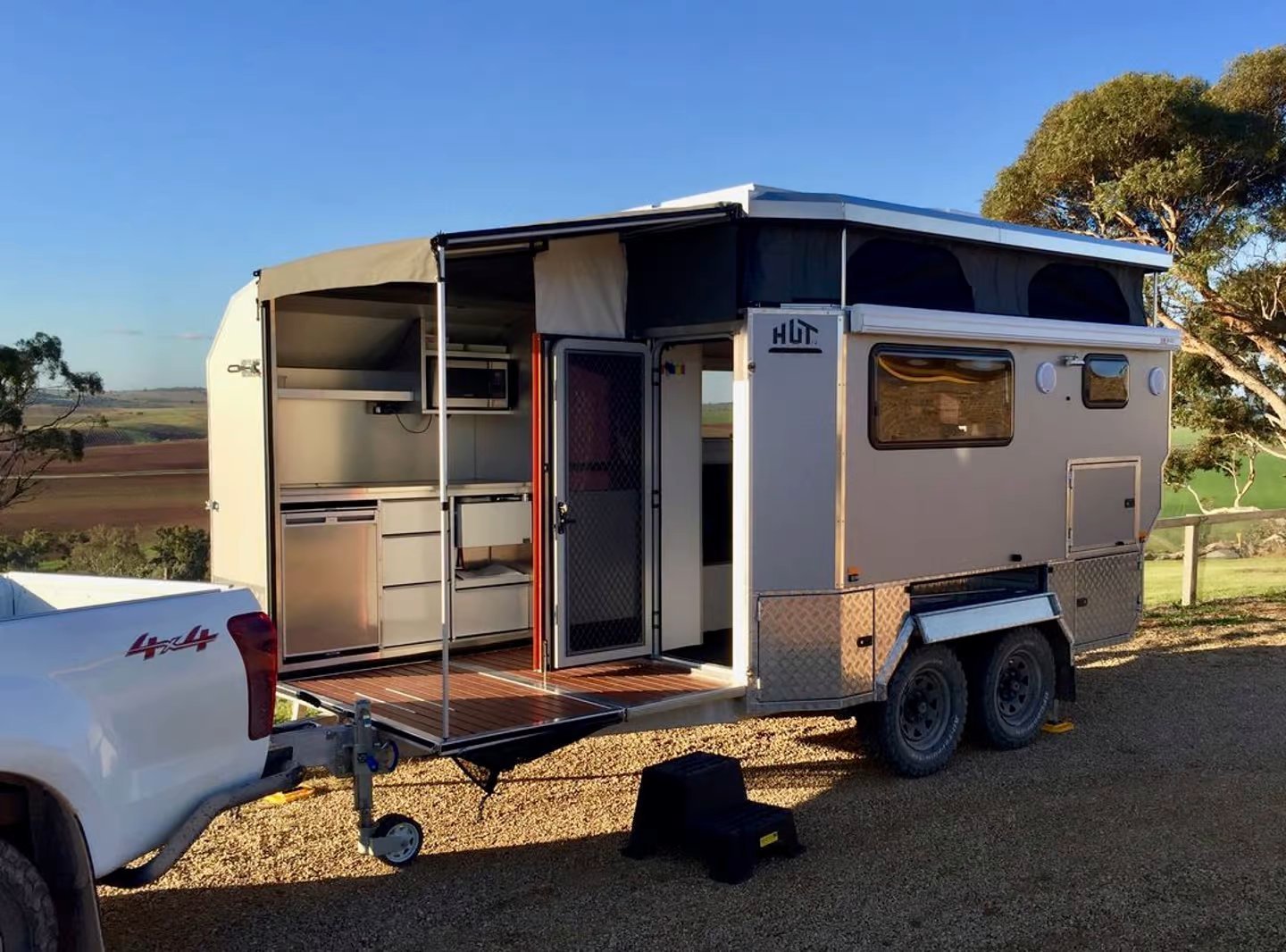 Typically, a camping trailer tongue box will carry a battery and possibly some tools, but the designers at Australia’s HUTrv have packed an entire kitchen and bathroom into their caravan’s oversized tongue box. The Dekpod expandable module, which swings open at camp to reveal a fully equipped kitchen and wet bath, packs neatly away as if it’s part of the main trailer body. This frees up the main cabin to sleep four to five people, allowing the caravan to live in a much larger space than it tows.
