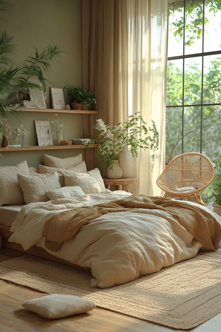 A peaceful bedroom interior is a serene retreat designed to promote relaxation and tranquility. It features a soothing color palette of neutral or pastel tones, complemented by soft lighting and minimalist decor. Natural materials like wood and linen enhance the organic feel, while cozy elements such as plush bedding, textured throws, and rugs create warmth. Thoughtfully placed greenery, calming artwork, and subtle scents like lavender add to the ambiance. With clutter-free surfaces, functional furniture, and hidden storage, the space maintains an uncluttered, harmonious vibe, perfect for restful sleep and quiet reflection.