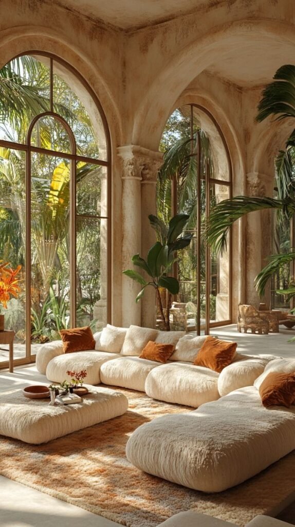 Combine textures like soft throws, velvet cushions, and woven baskets to make the room feel cozy and inviting.