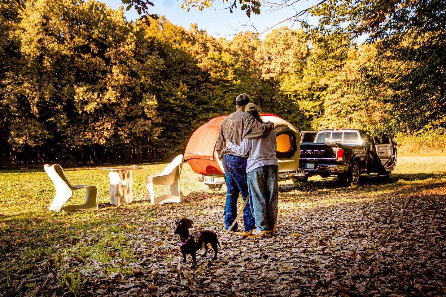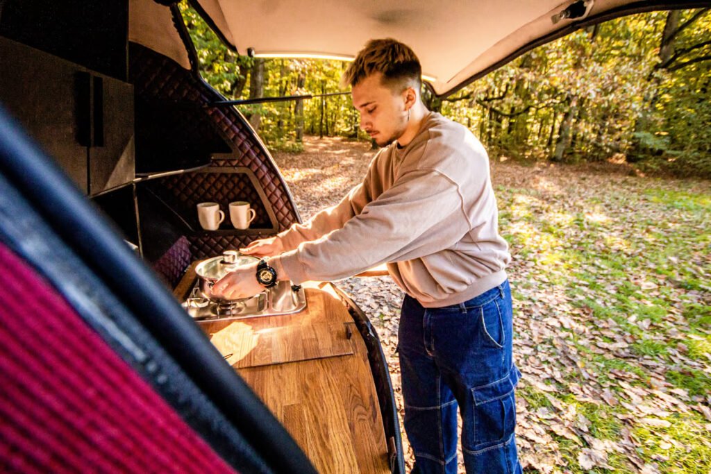 Inside, the cozy interior features a bed, shelving, and minimal storage, ensuring simplicity and functionality for camping enthusiasts. The exterior includes a flip-up tailgate, revealing a basic yet practical galley kitchen equipped with a propane-powered two-burner stove and a sink. For added versatility, optional upgrades include a solar panel kit with batteries, perfect for running small appliances like a mini-fridge or TV. Integrated sensors for temperature and water levels enhance convenience and monitoring.