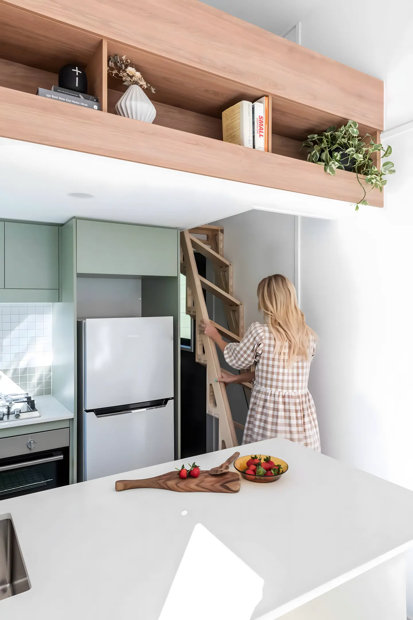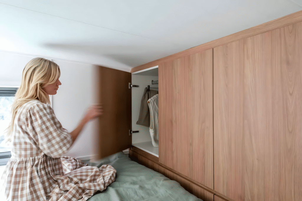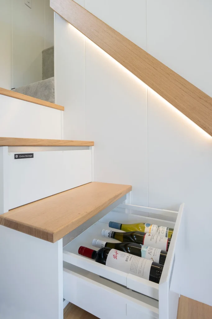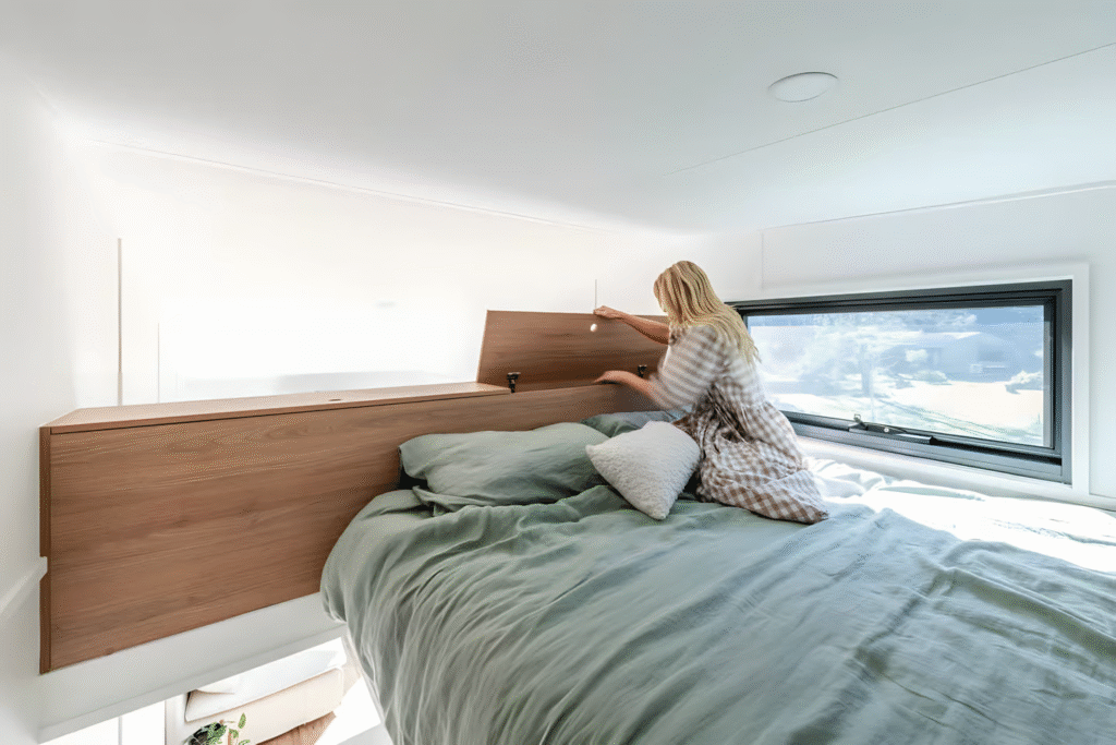 Space-saving ideas are at the heart of the Jordy’s design. To optimize floor space and maintain easy access to the bathroom, Konpak Tiny Homes has installed an innovative folding staircase from Bcompact. This space-saving ladder folds flat against the wall when not in use and unfolds smoothly to provide access to the loft area. While unconventional, this clever design solution highlights the best of compact living strategies.