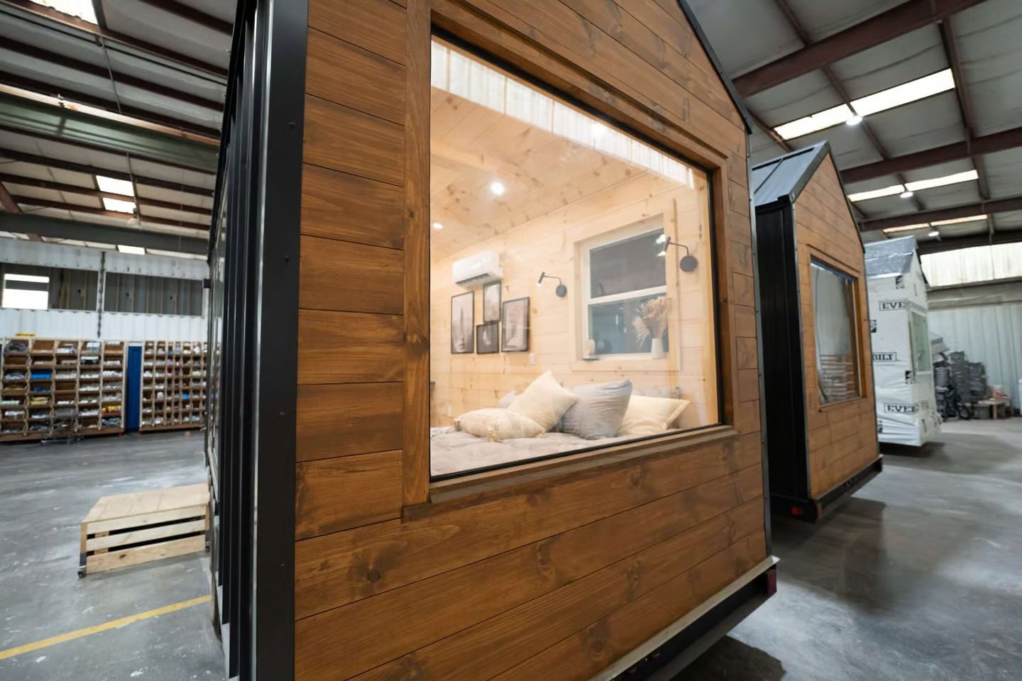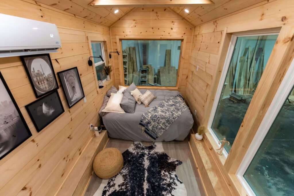 The bedroom area, located opposite the kitchen, includes a double bed, with enough space for a small sofa or seating, making it ideal for minimalist living. A mini-split air-conditioning unit and ceiling fan ensure the home stays comfortable year-round.