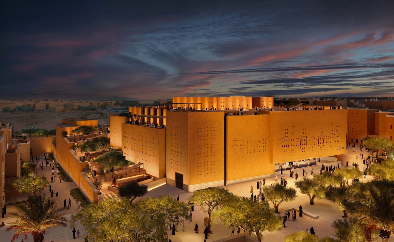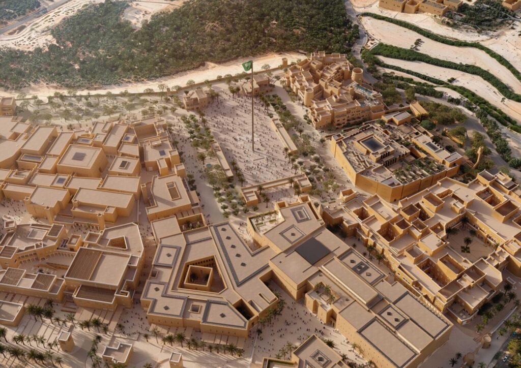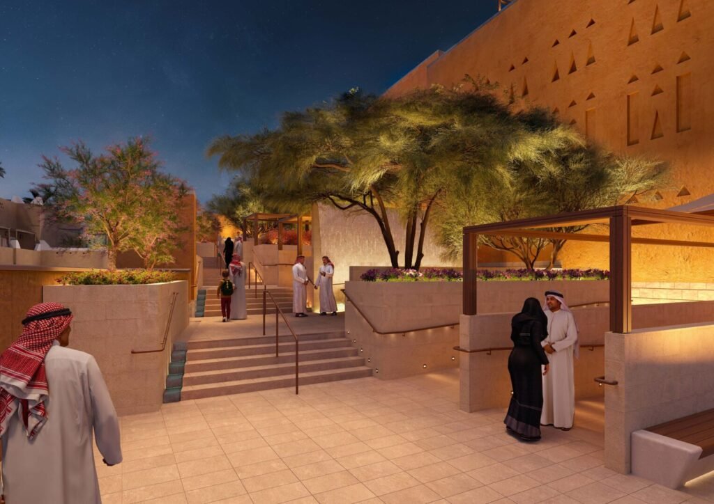 Embracing sustainable architecture, the museum will be constructed using traditional adobe (mud brick), reflecting the historic Najdi architectural style. The three-story structure will feature thick, insulating walls and three shaded courtyards, providing natural cooling in the desert climate. Additional design elements include shaded gardens, plazas, and rooftop promenades, all aimed at enhancing visitor comfort and sustainability.