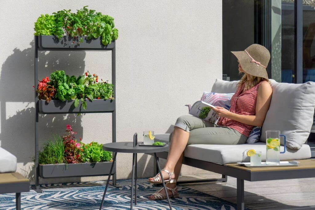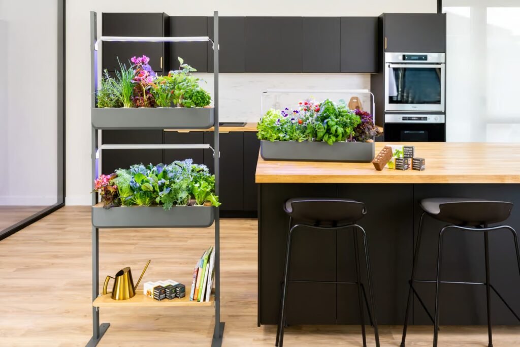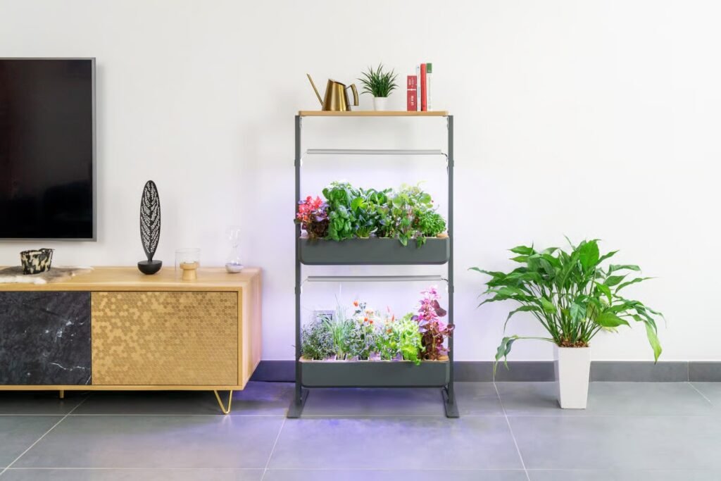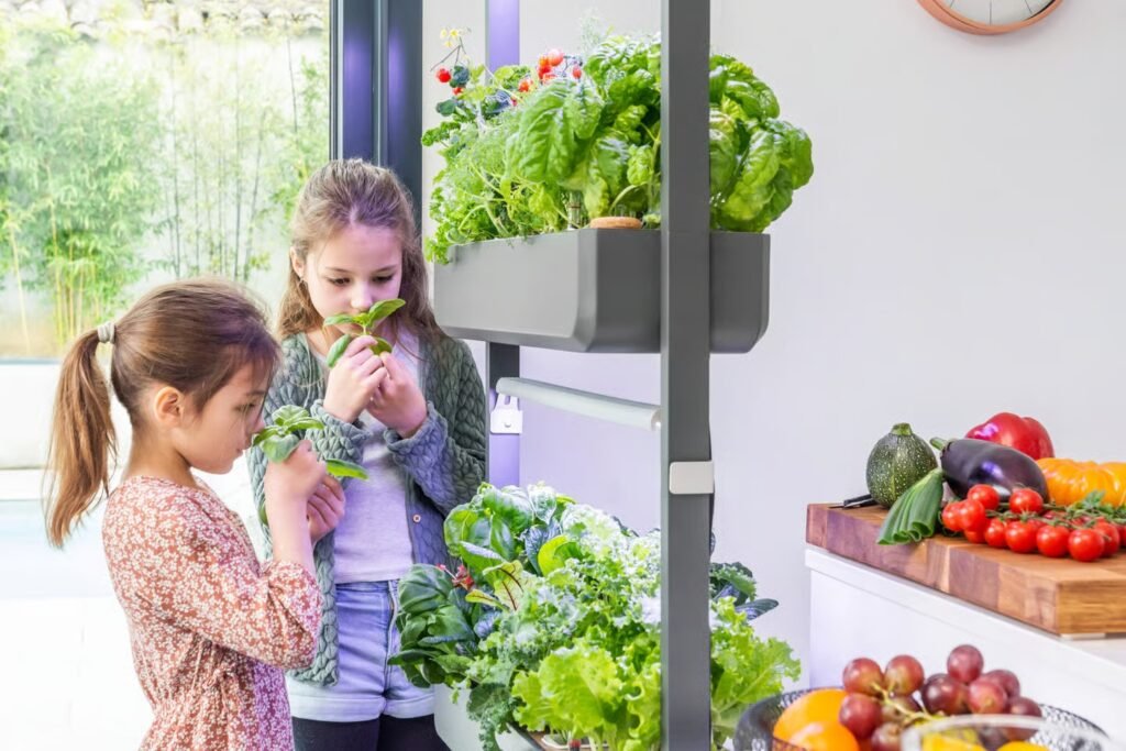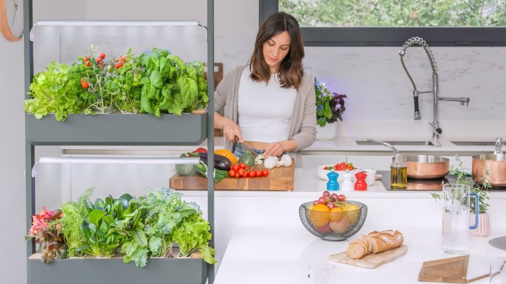 Automation is a key feature, with passive hydroponics and optional autofill. Indoor setups include adjustable LED grow lights, and a mobile app provides guidance.