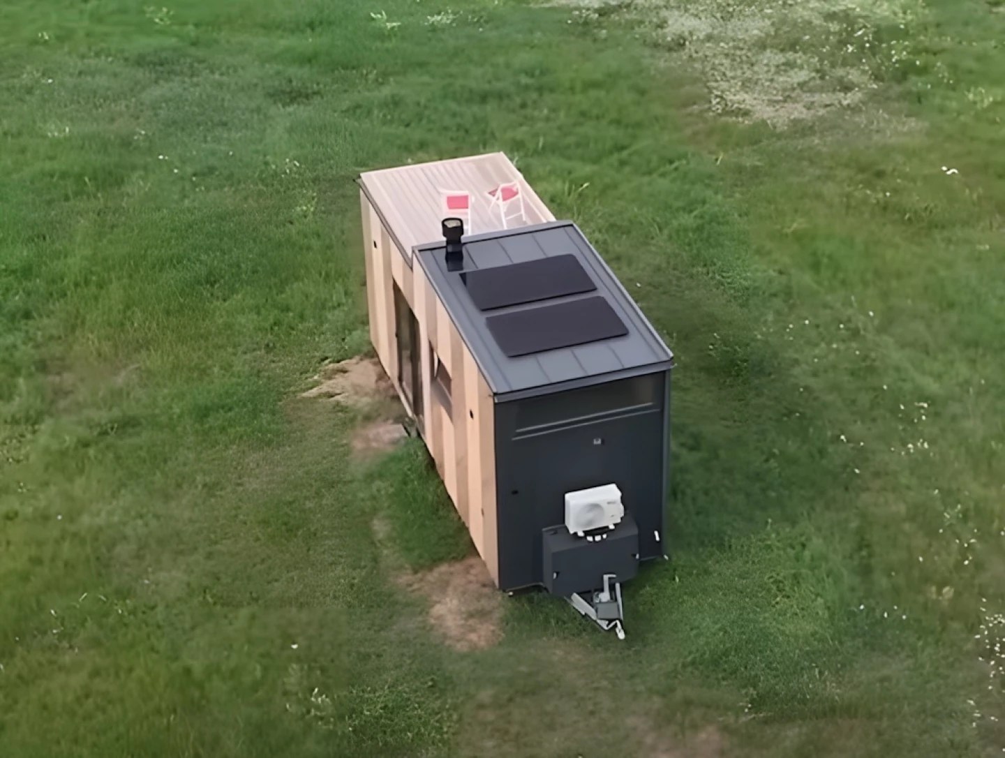 Step inside, and you’ll find a cozy open-plan layout that feels surprisingly roomy. The living area includes a comfortable sofa with built-in storage, while the kitchen area comes equipped with a sink, fridge, and cabinets. There’s even space to add extra appliances, so you can make this smart home truly your own. A compact wood-burning stove keeps the entire space warm and cozy, ideal for colder climates in the USA, UK, Canada, or even the Australian highlands.
