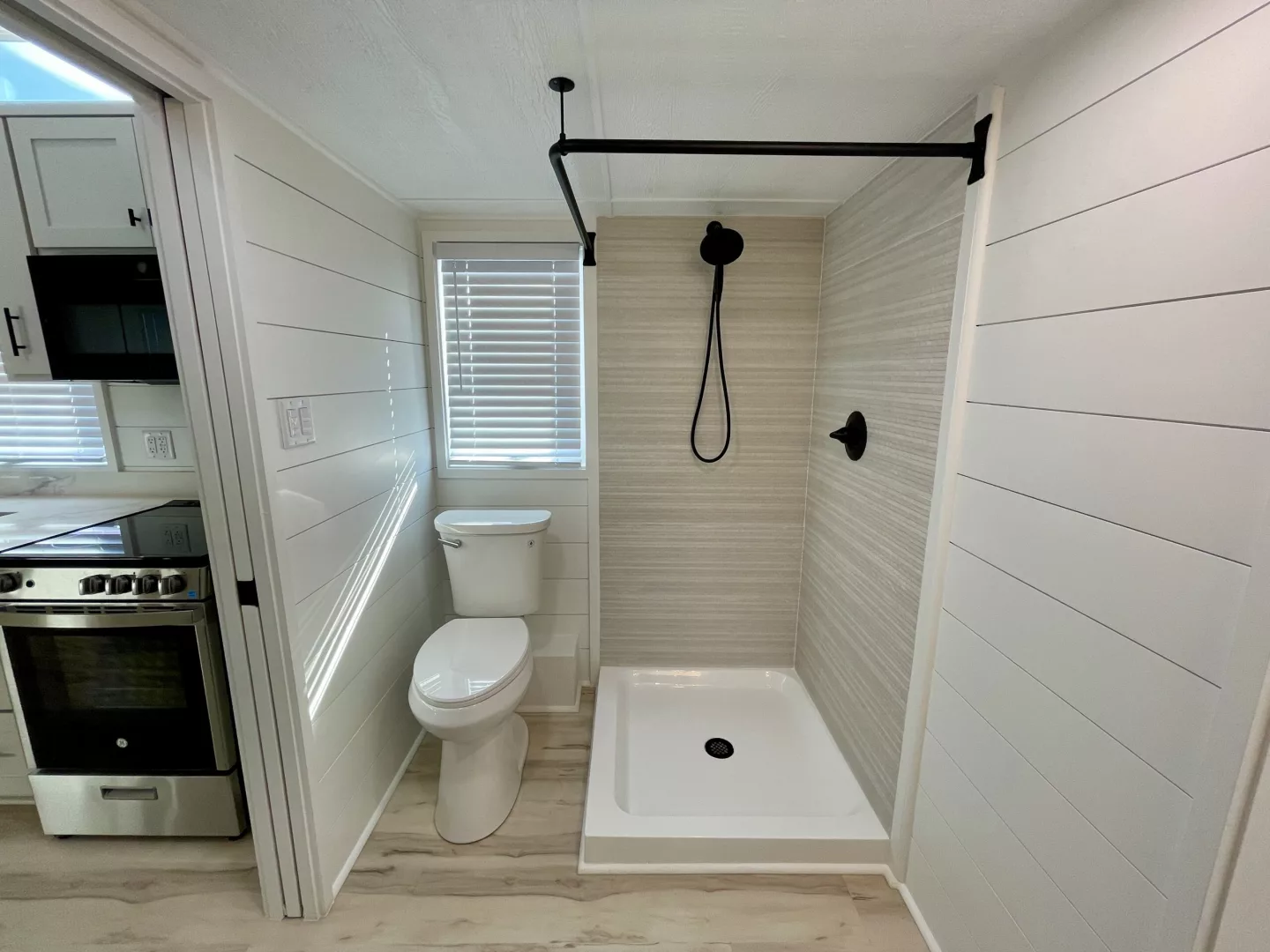 Connected seamlessly to the kitchen, the bathroom maximizes that extra width with a full shower, flushing toilet, vanity sink, and space for stacked washer and dryer units – ditching the compact combo models for true convenience. It’s a nod to eco-friendly tiny homes that prioritize daily livability.
