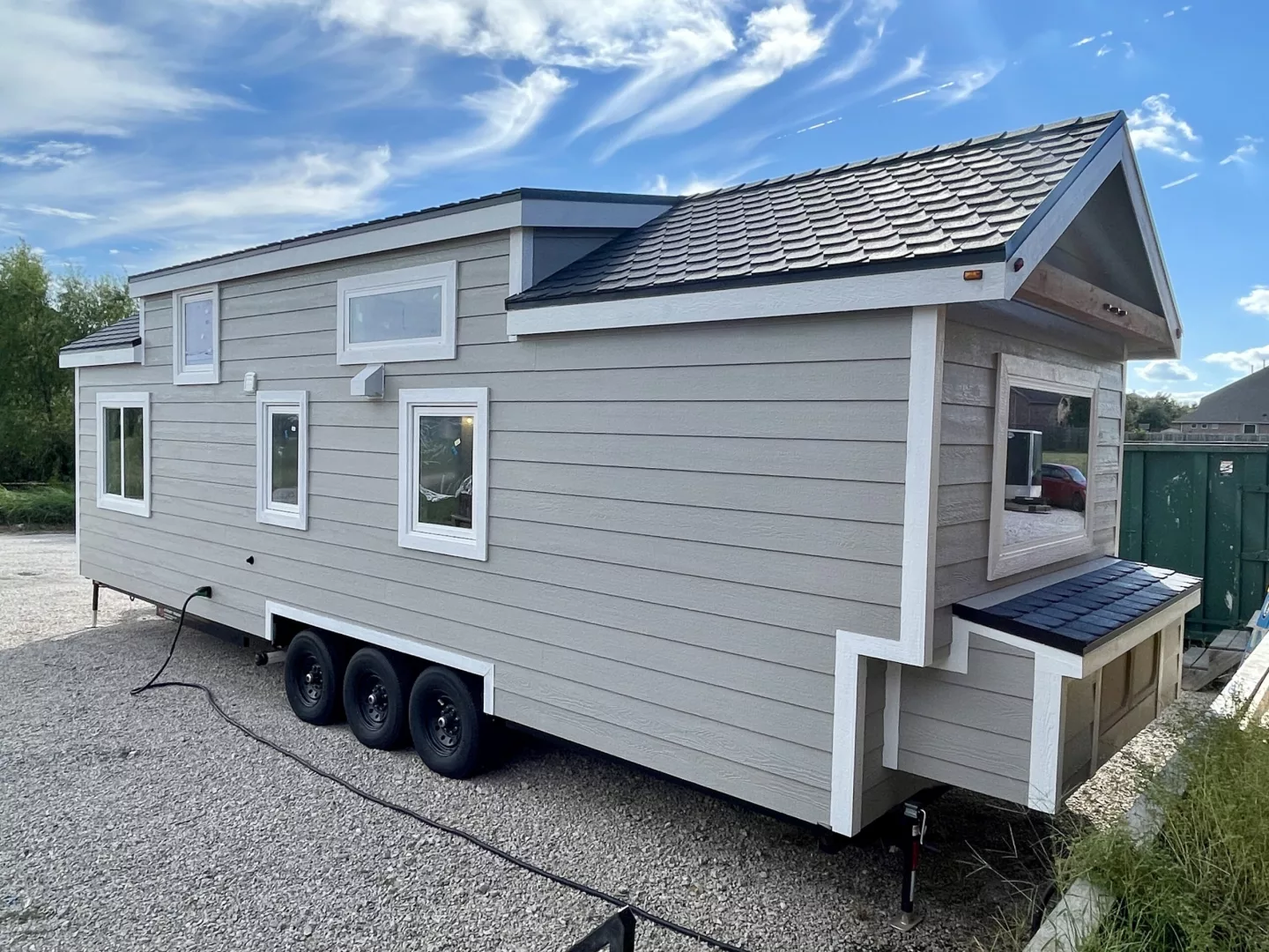 The exterior boasts durable gray smart siding and synthetic roof shingles for low-maintenance appeal, plus a handy mounted storage box for propane tanks, tools, and outdoor gear – essential for adventurers in the UK’s countryside or Australia’s outback.