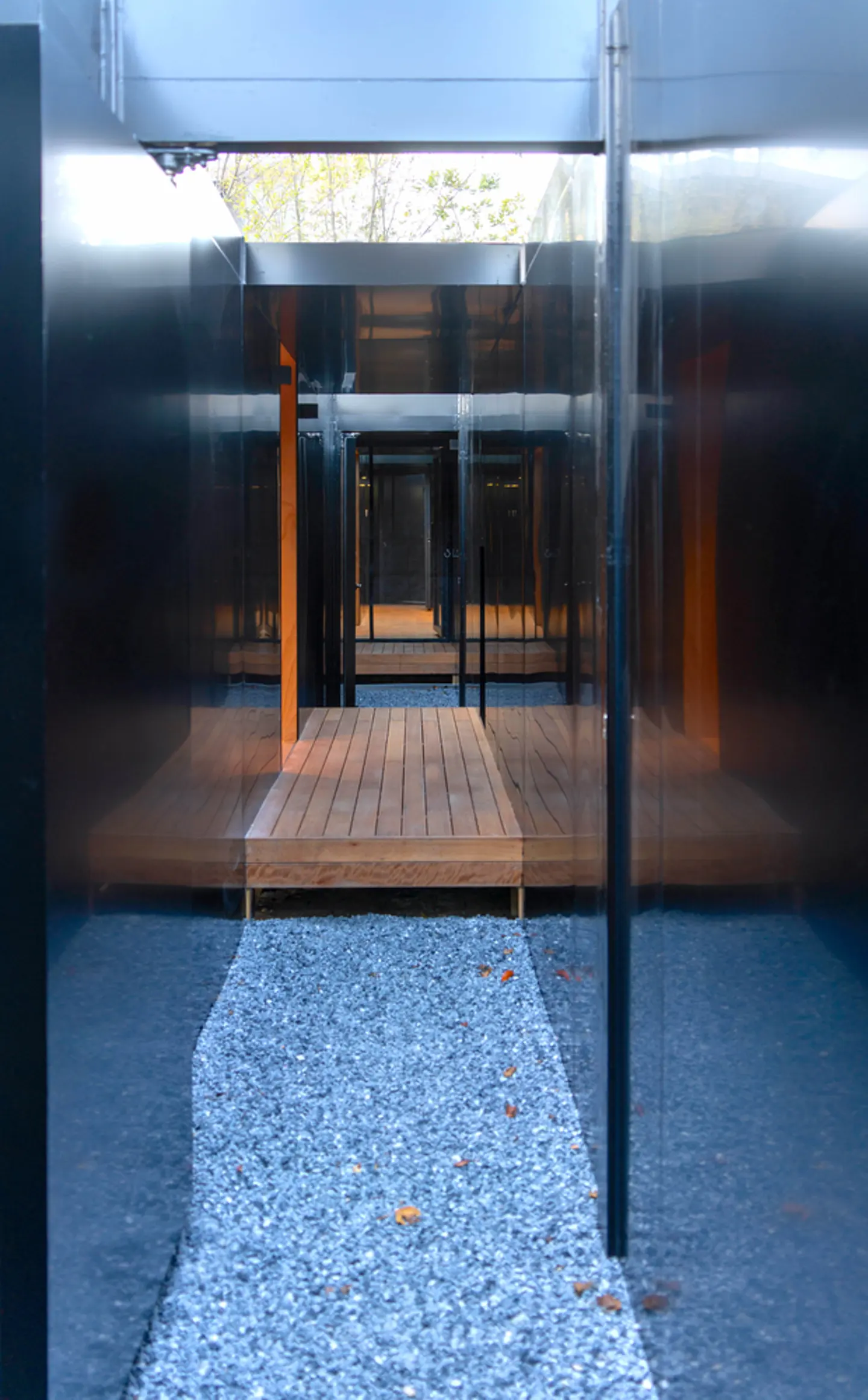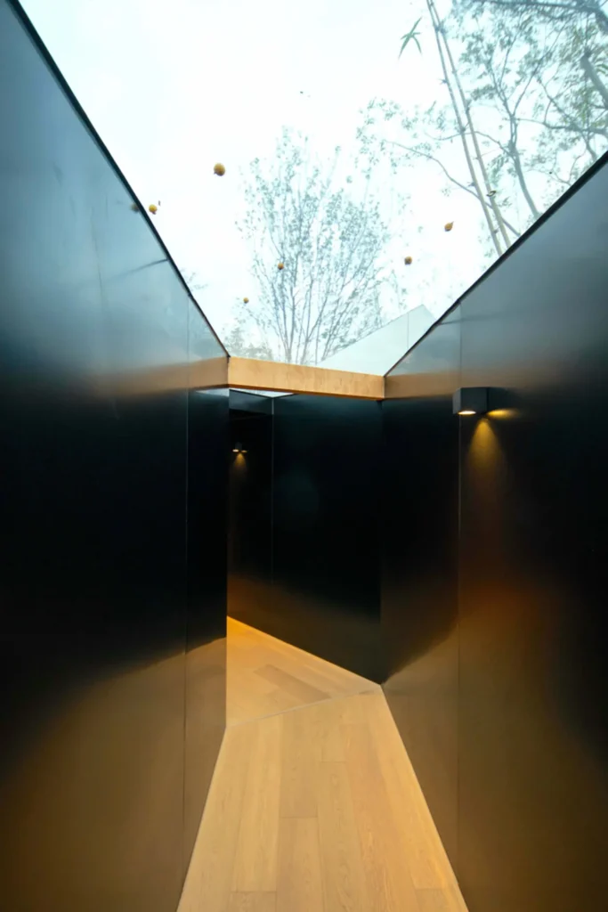 By utilizing carbonized wood, the retreat promotes eco-friendly architecture and significantly reduces the carbon footprint of the building process.