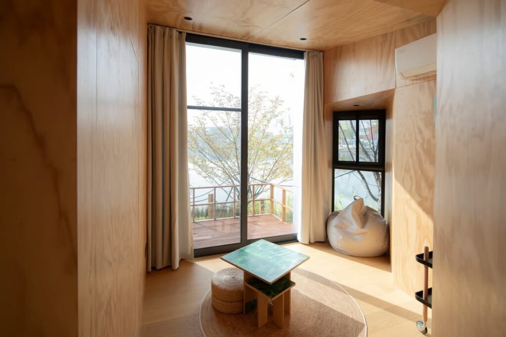 The interior design of Cabin of Maze prioritizes simplicity and nature integration.