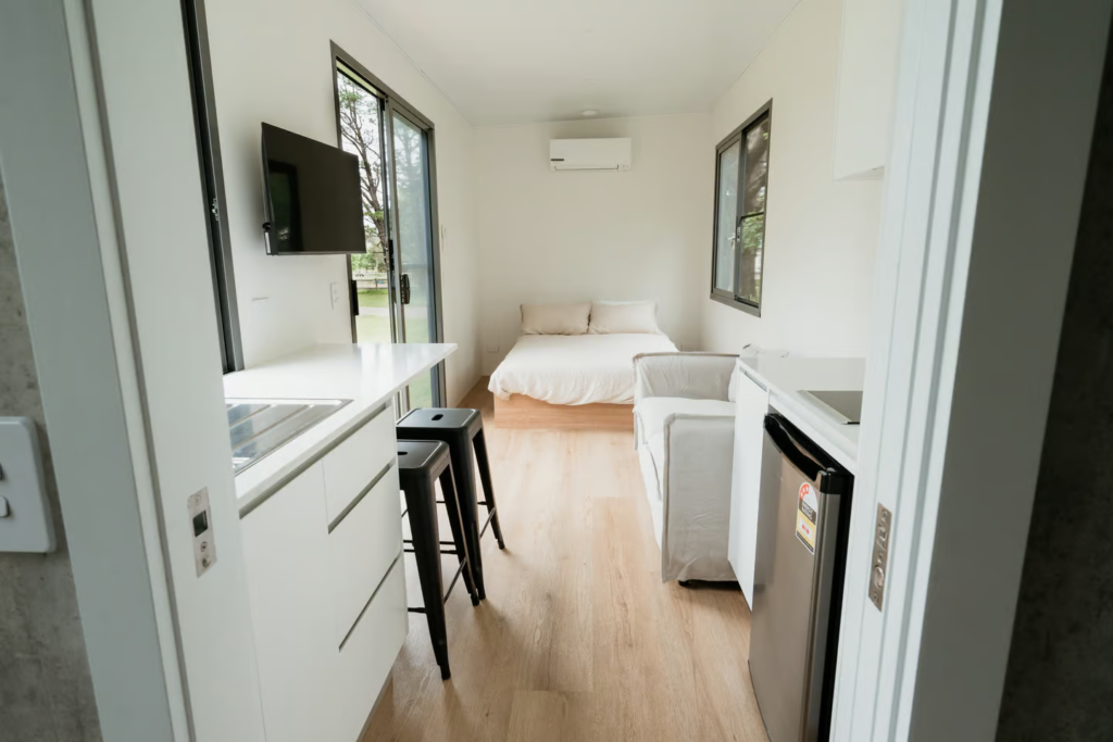 On the opposite end of the home, the bedroom offers ample headroom, allowing residents to stand up and move around comfortably—a rare luxury in most tiny homes. The double bed comes with integrated storage, optimizing space efficiently. Additionally, there is an option to add a second bedroom for those needing extra sleeping arrangements.