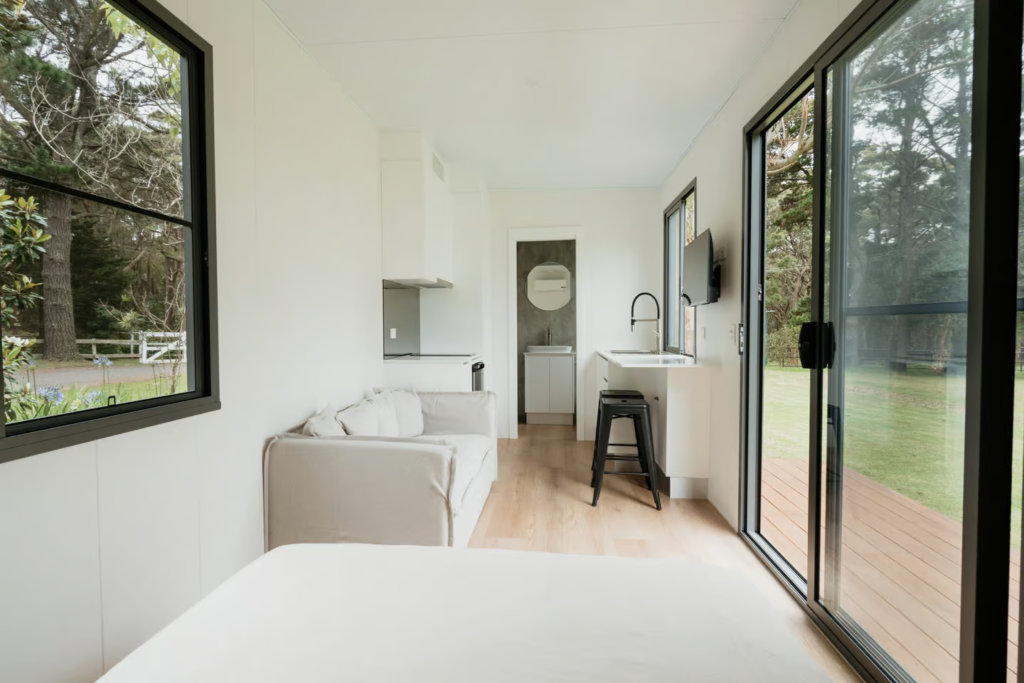 The entrance boasts large double glass doors, allowing natural light to flood the interior and create a bright, open ambiance. The single-story layout ensures everything is within reach, making it a perfect tiny home for off-grid living or a vacation retreat. The living area includes a comfortable sofa and a wall-mounted TV, making it a cozy space to relax after a day of adventure.