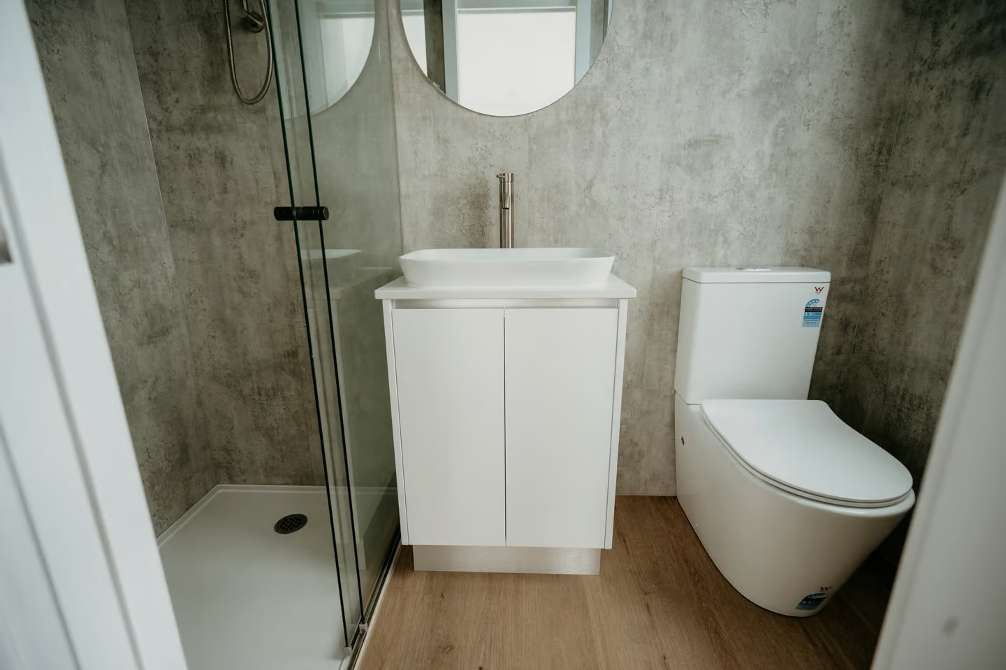 The bathroom, located next to the kitchen, is compact yet functional. It includes a shower, sink, and a flushing toilet, with options to upgrade to a composting or incinerating toilet for those looking to maximize sustainability.