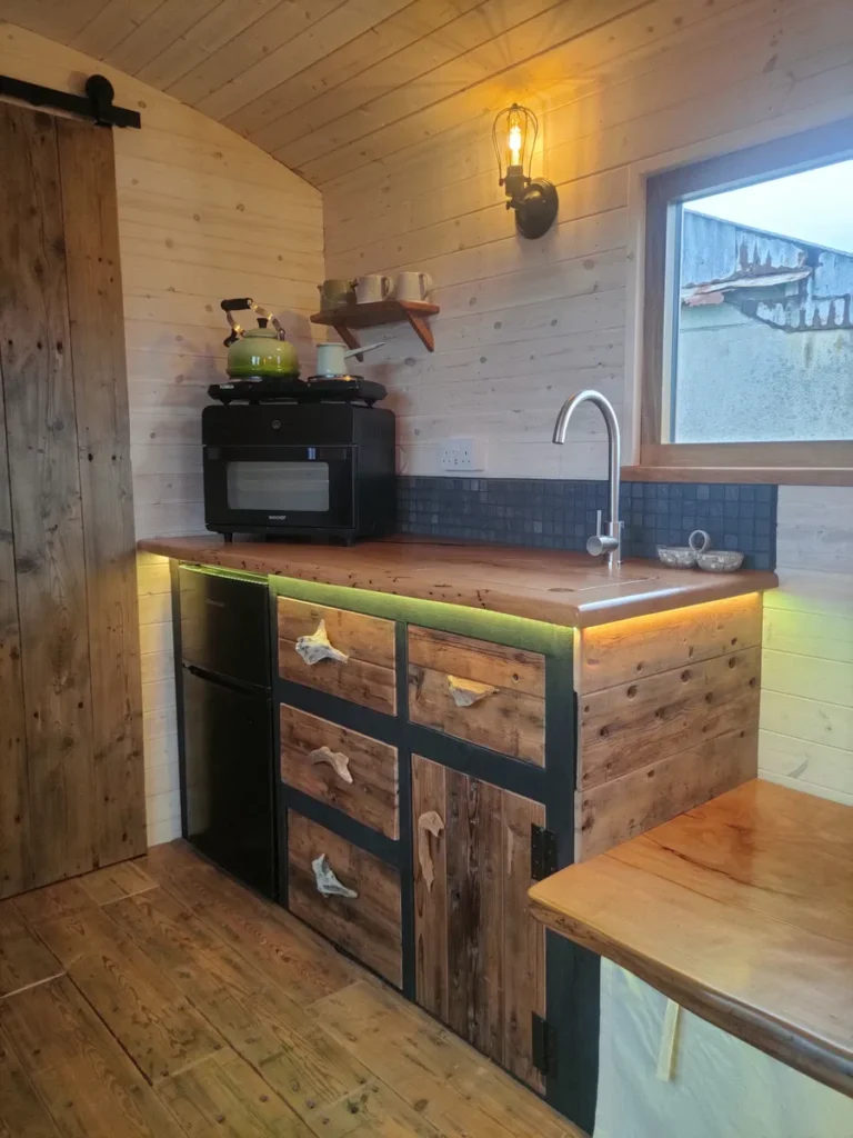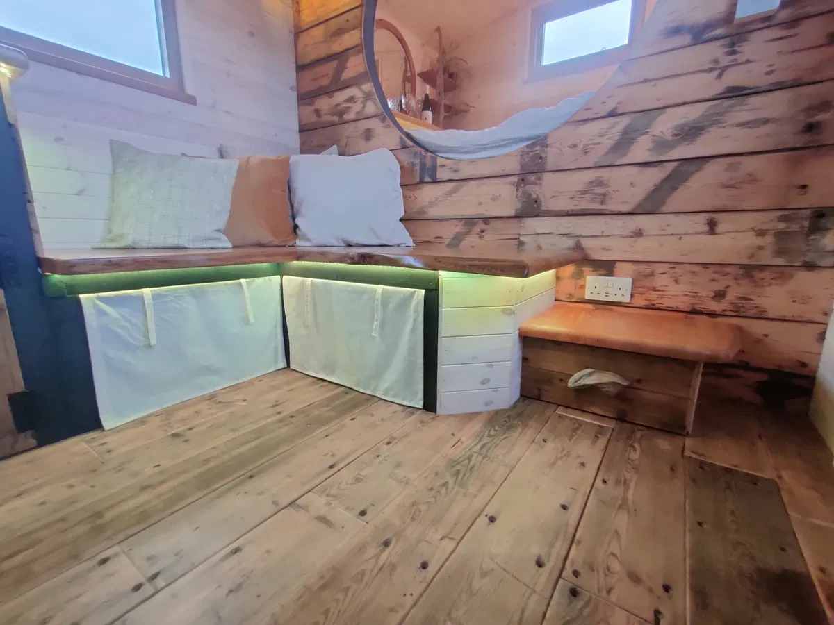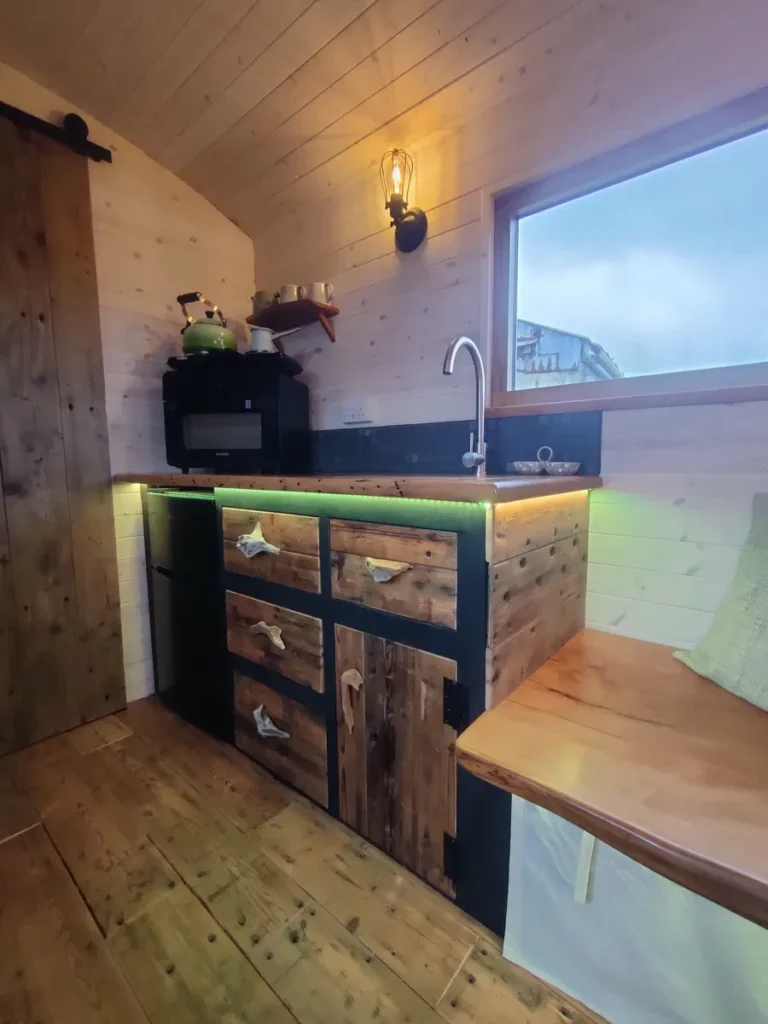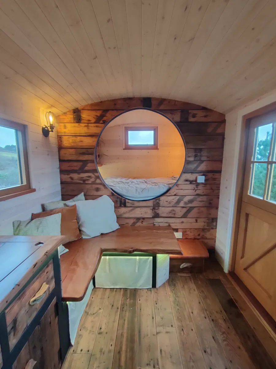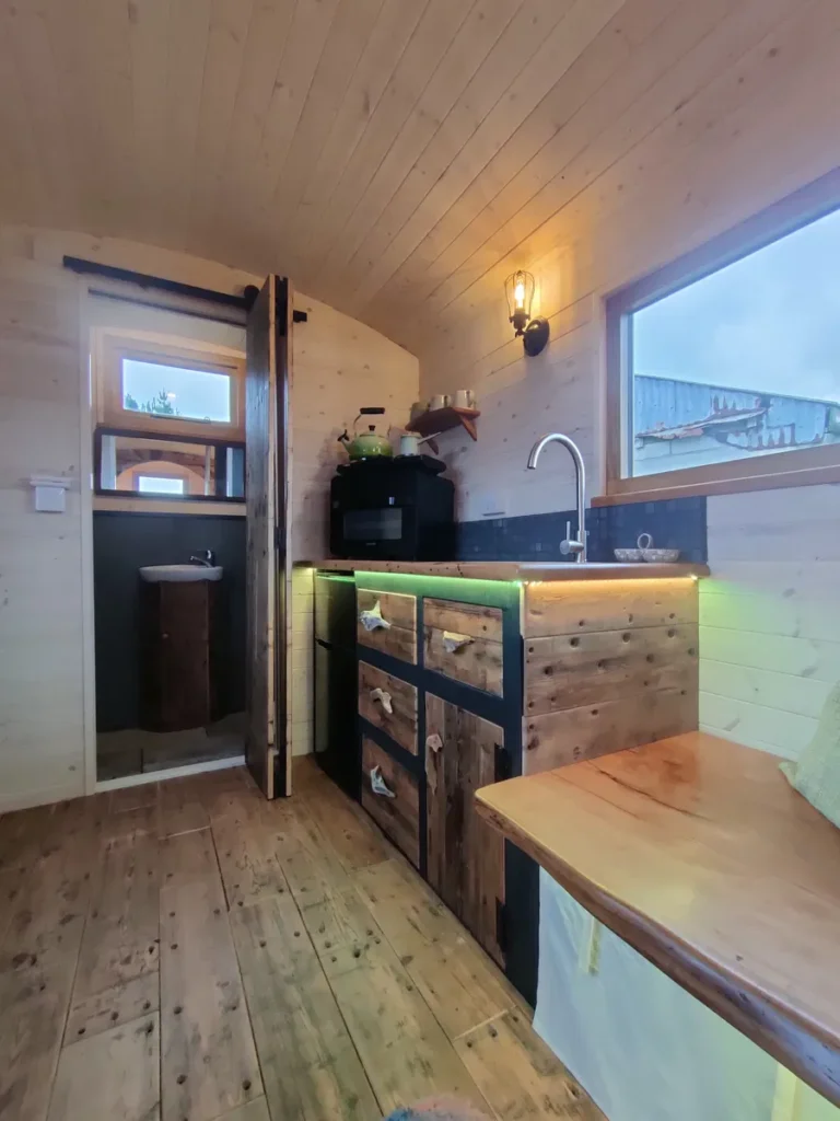 Inside, the compact 144-square-foot (13.4-square-meter) interior is thoughtfully arranged on a single level, utilizing reclaimed wood from other old railway cars to maintain a historical ambiance. The entrance features large wooden double doors that open into a living area with an L-shaped seating arrangement, which includes integrated storage solutions—a clever feature for those interested in DIY tiny house furniture.