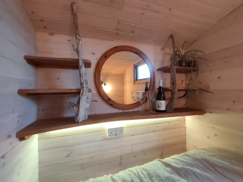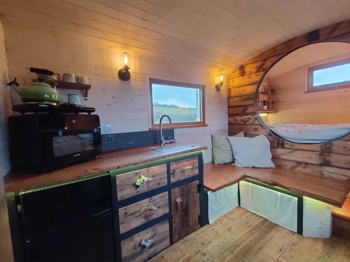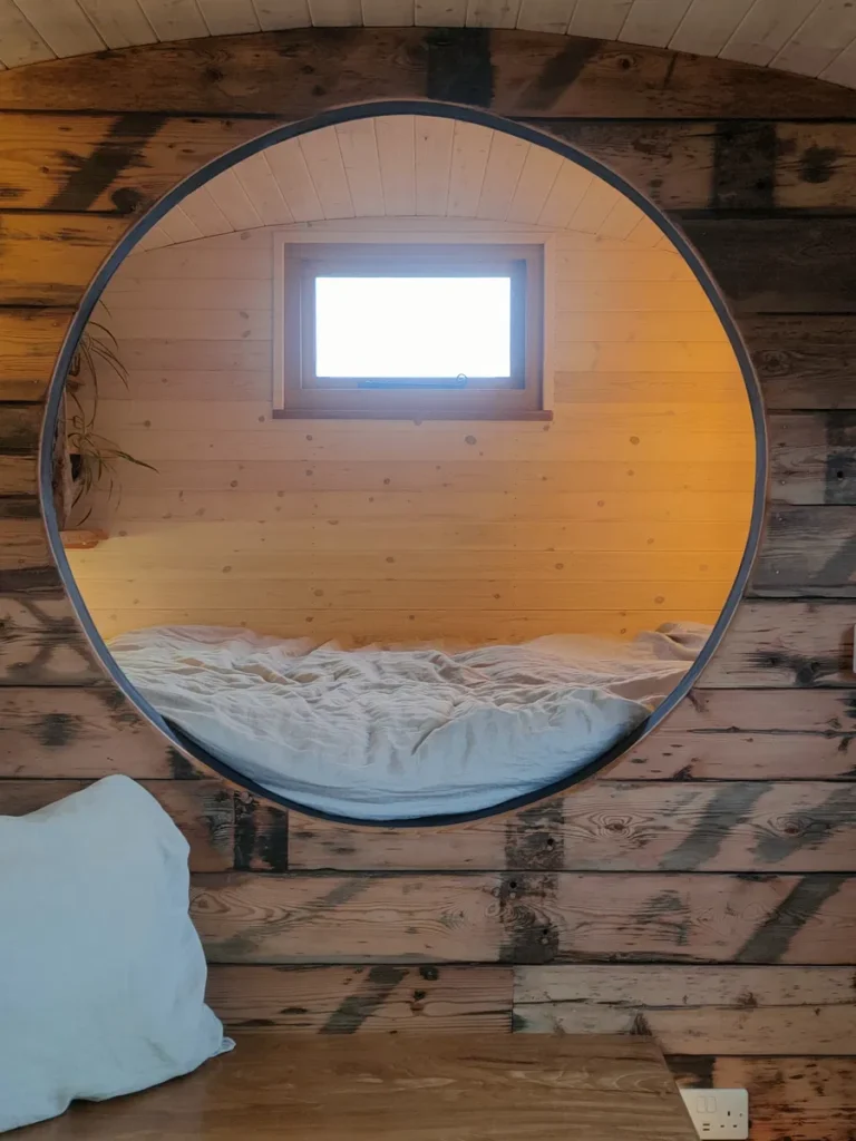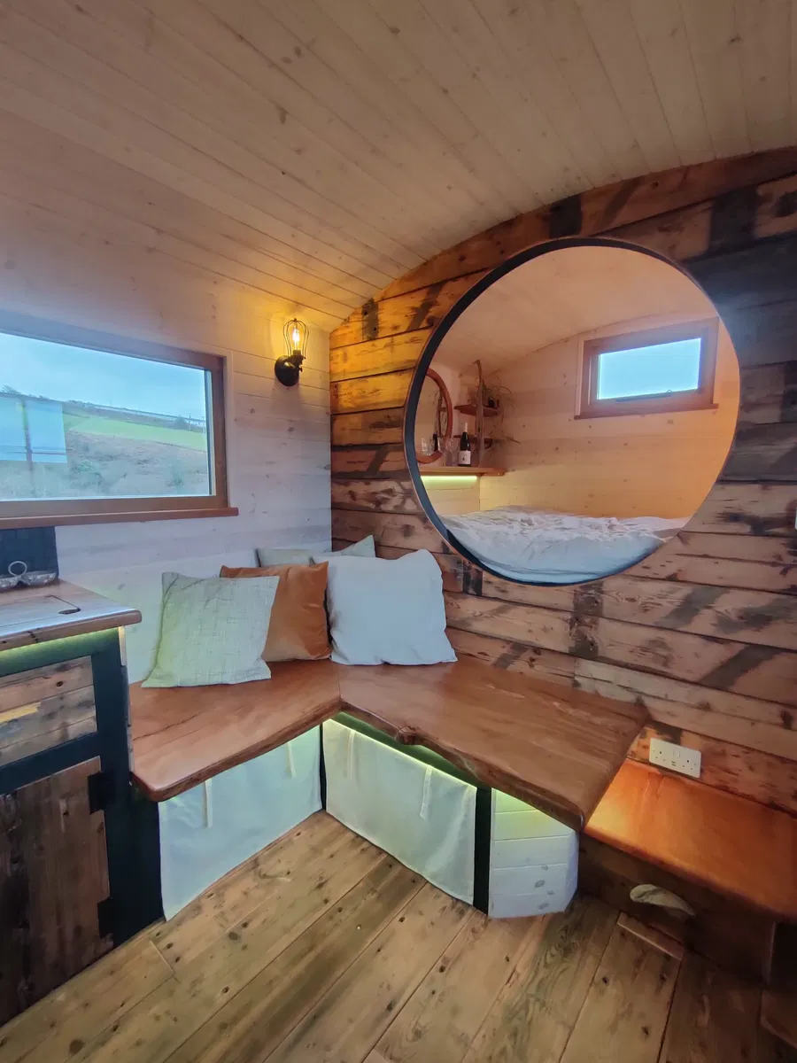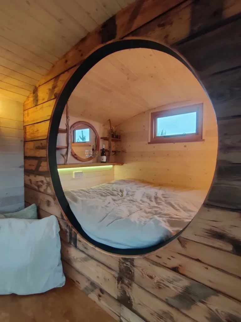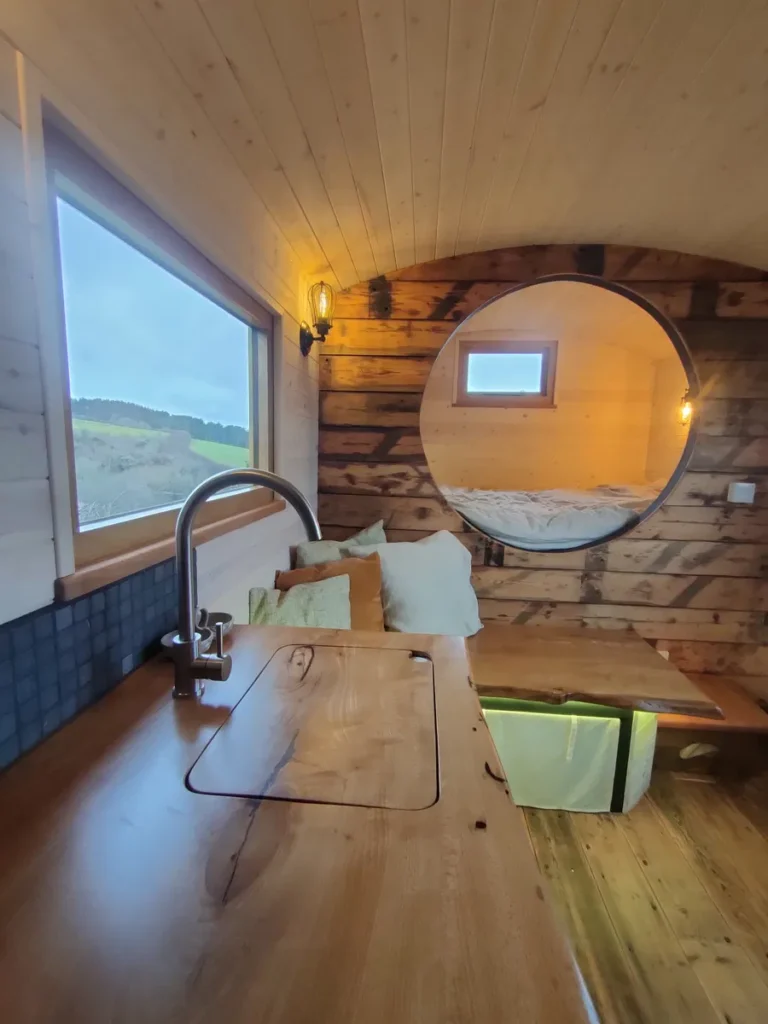 Adjacent to the living space is a minimalist kitchen equipped with a sink featuring a removable cutting board insert, a microwave, a fridge, and cabinetry, exemplifying efficient tiny house kitchen design. A porthole-style circular opening leads to the bedroom, which accommodates a double bed, showcasing smart tiny house interior design.