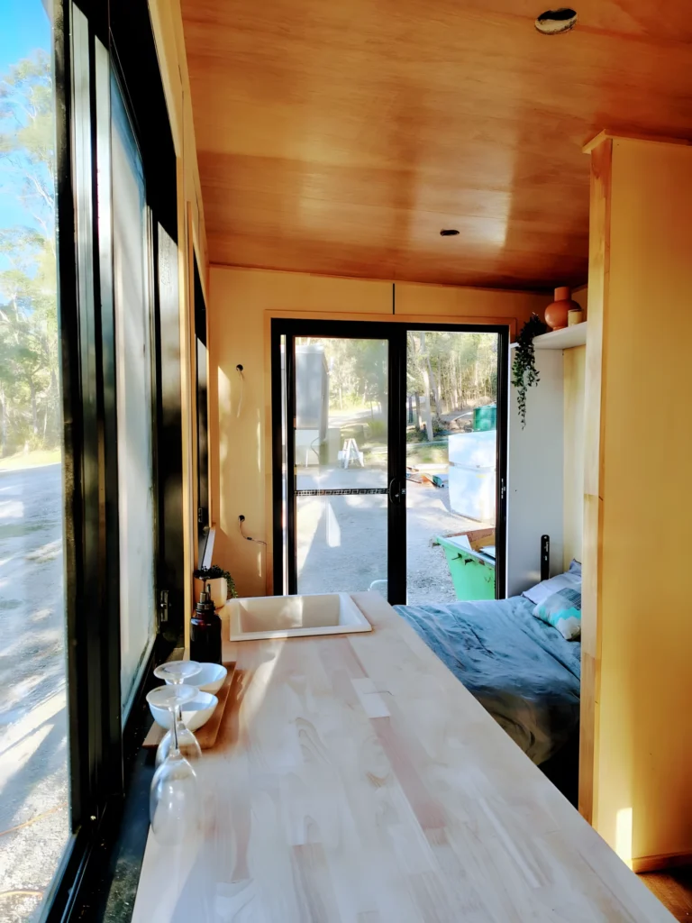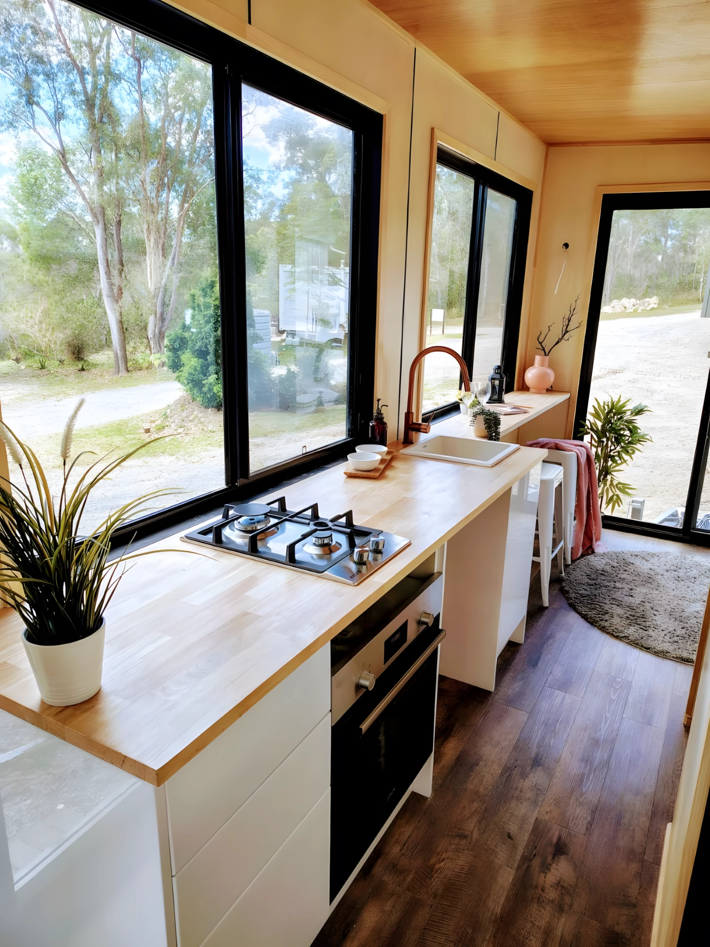 The dining area transforms, too, with a breakfast bar doubling as a workspace when needed — perfect for those seeking work-from-home flexibility in a tiny house lifestyle. Stone-style interior keeps it airy, while large windows enhance the feel of space, blurring boundaries between indoors and out.