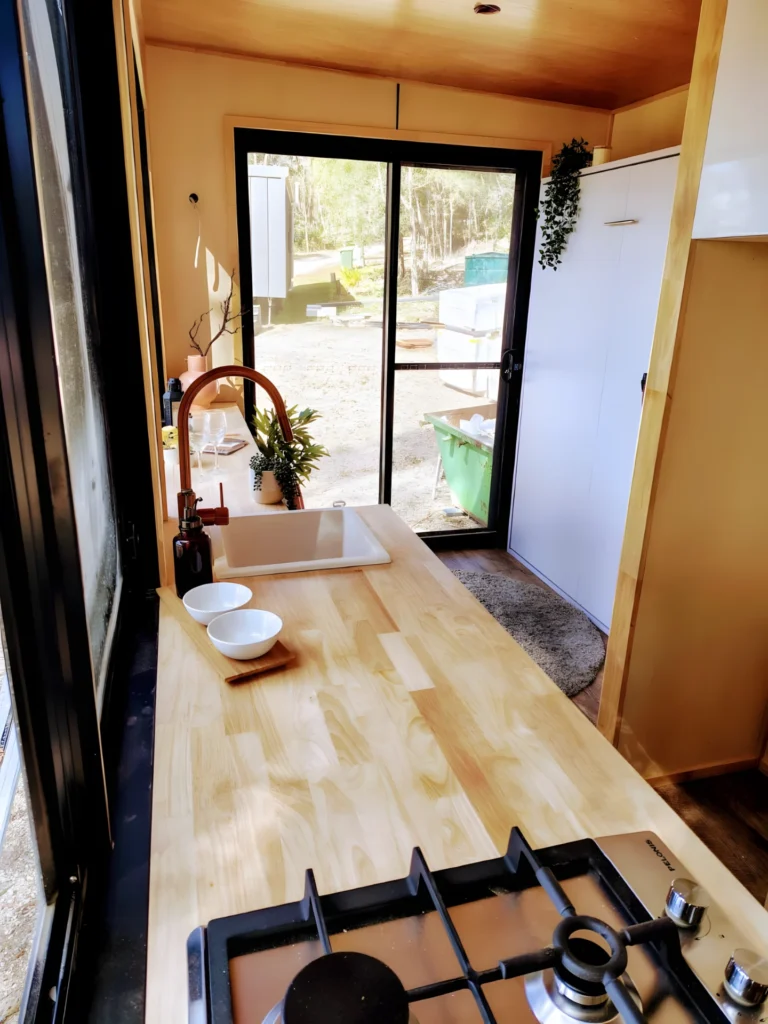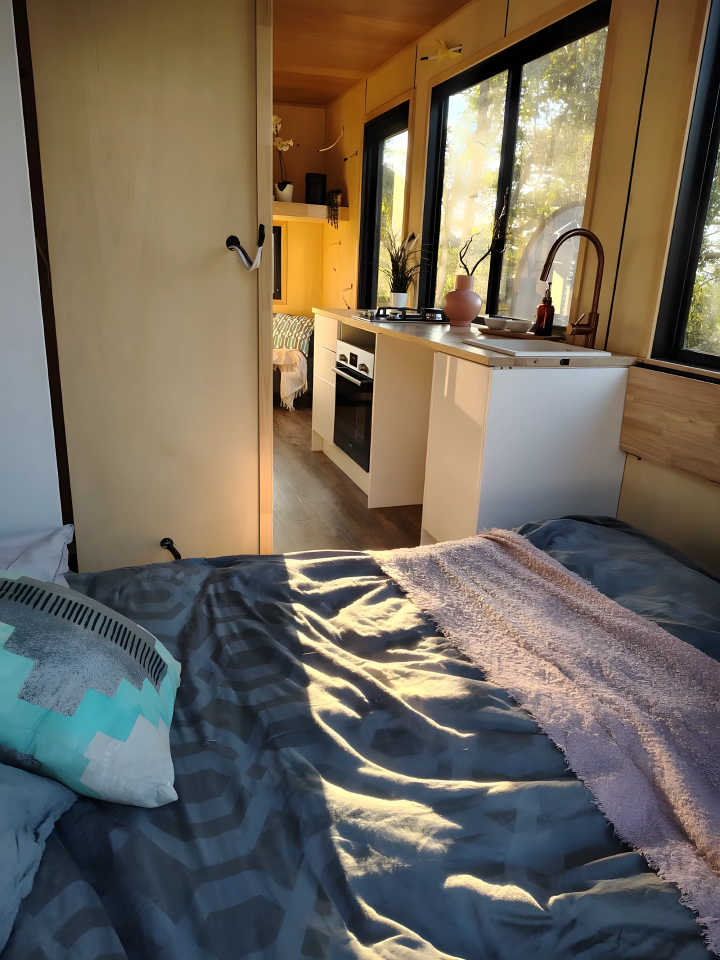 Inside this tiny house, the single-floor layout revolves around a multi-functional bedroom/office. Thanks to a Murphy style folding bed, the same area transitions effortlessly from a cozy bedroom to a home office, yoga studio, or living space, bringing versatility to tiny living. Adjacent, a compact kitchen features a propane cooktop, oven, sink, and space for a fridge and washer/dryer, optimized for efficient small space living.