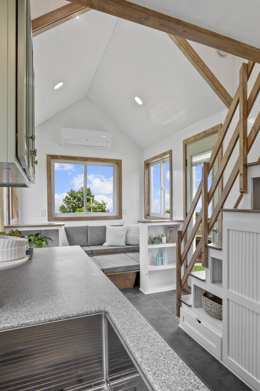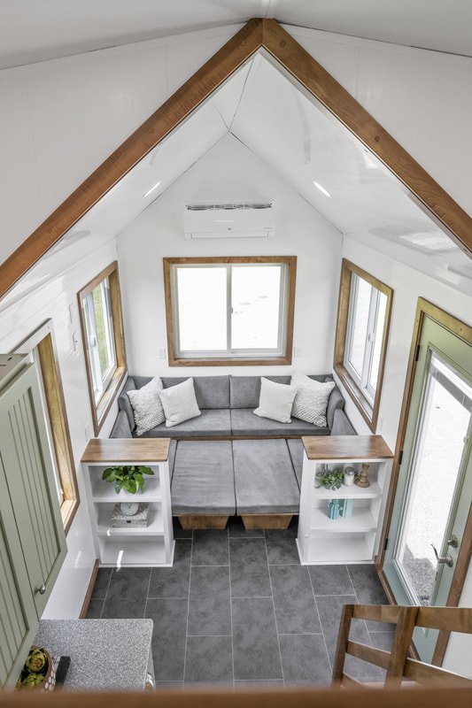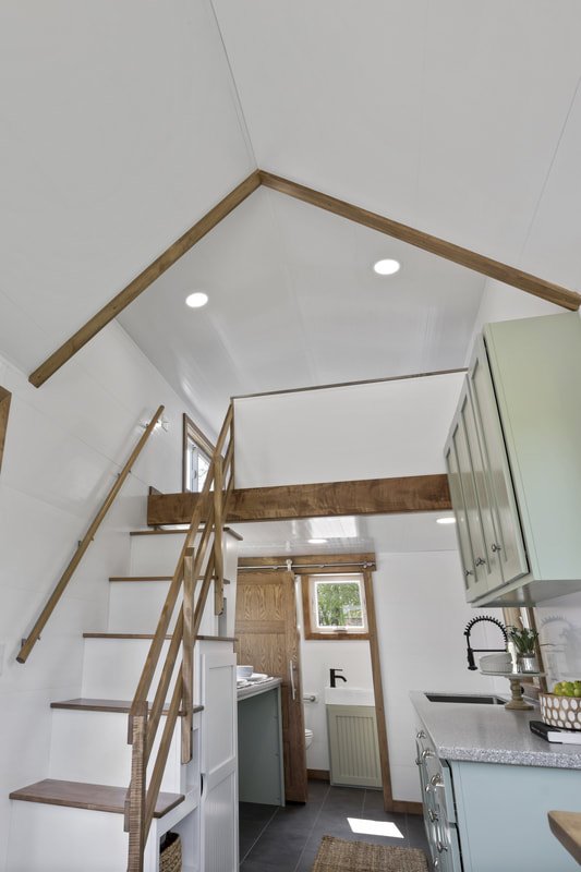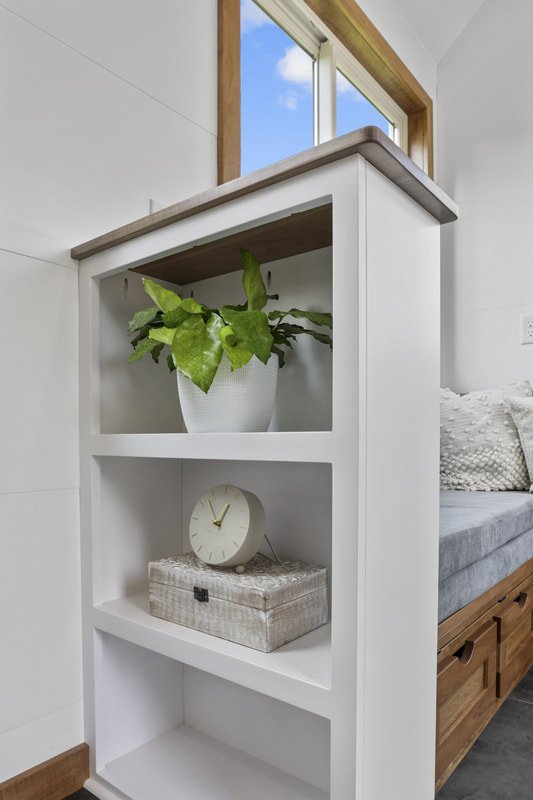The tiny house features a single bedroom located in a loft space, accessible via a storage-integrated staircase. This typical tiny house-style loft offers a double bed, albeit with a low ceiling, and provides additional storage space that serves as a dividing wall for privacy.