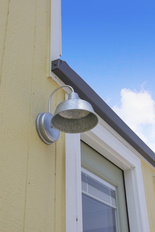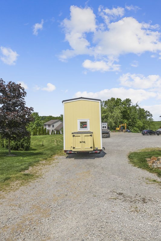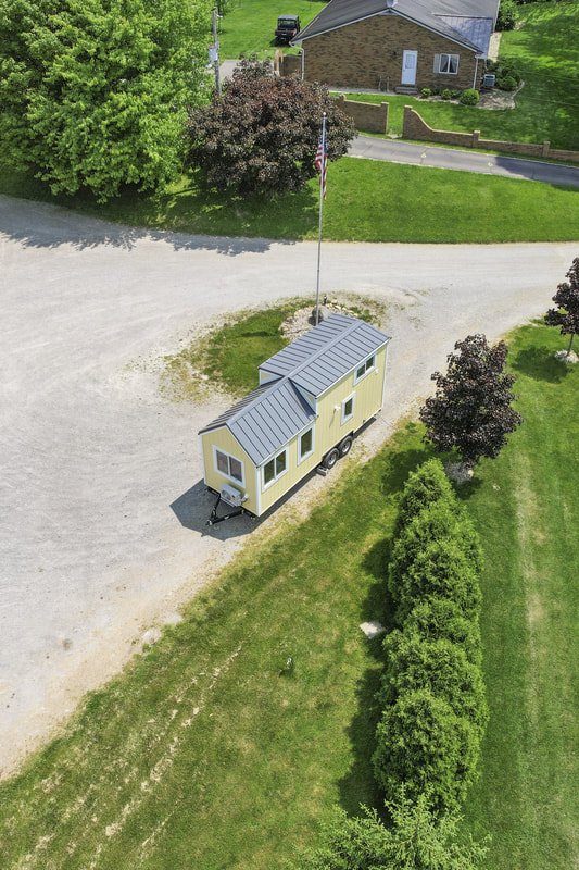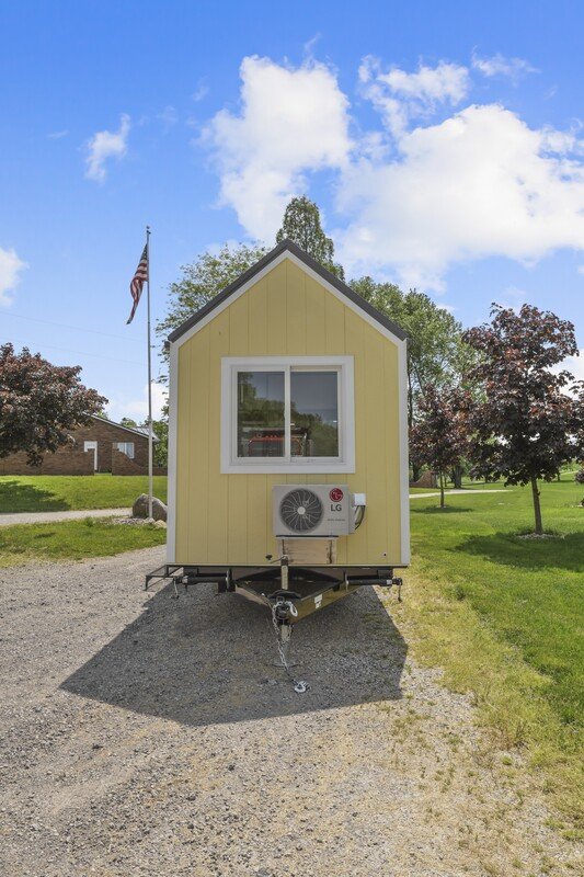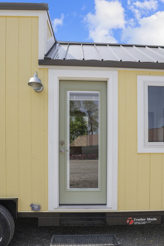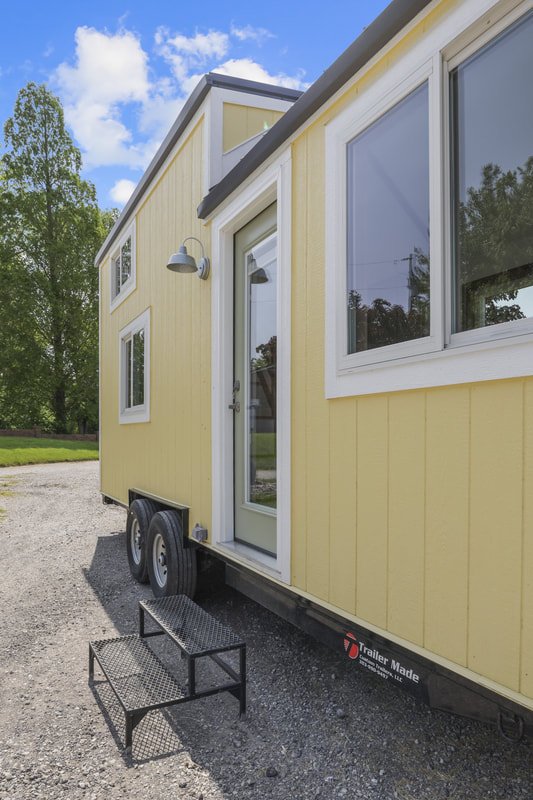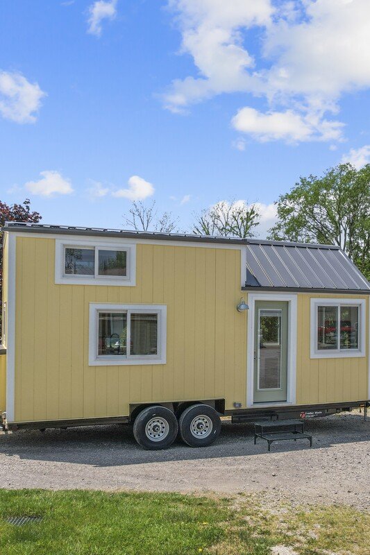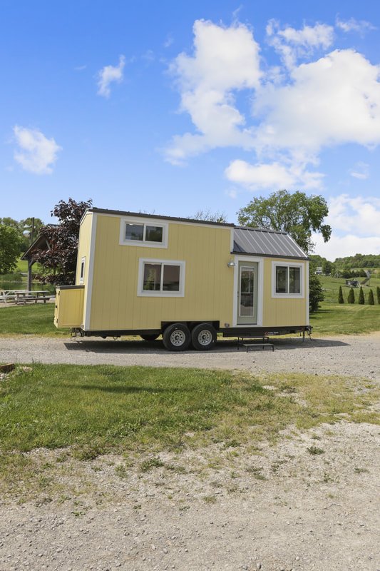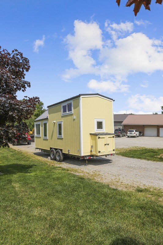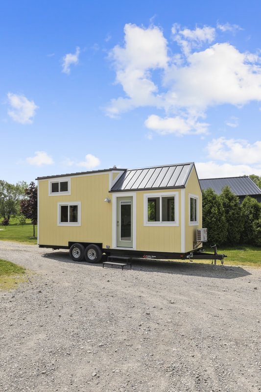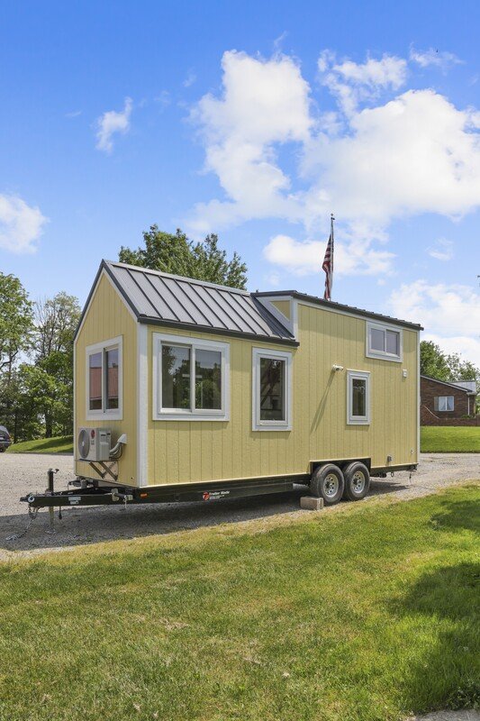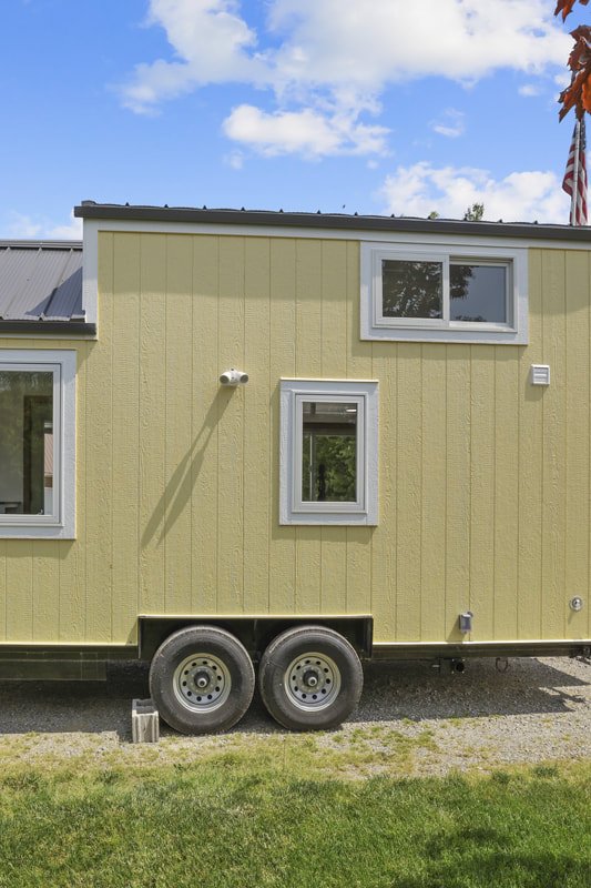 The Buttercup by Modern Tiny Living is designed as a weekender/vacation home but can also serve as a full-time residence if desired. It is relatively small for a North American tiny house, especially when compared to larger models like the Canada Goose. Built on a double-axle trailer, it features engineered wood siding and a metal roof. Power is obtained through a standard RV-style hookup.
