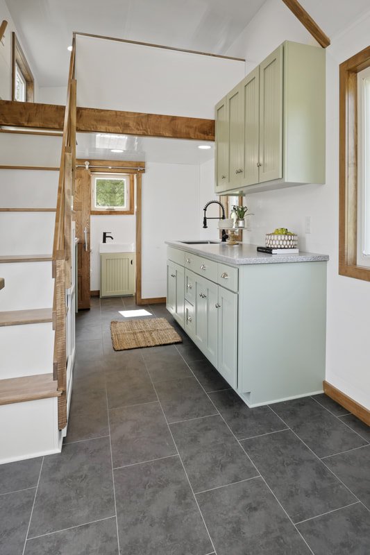 Accessible through a sliding barn-style door from the kitchen, the bathroom in the Buttercup is compact, housing a shower, flushing toilet, sink, and shelving.