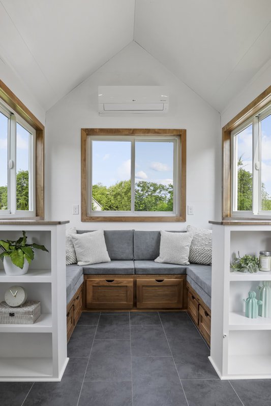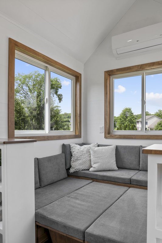 Upon entering the Buttercup, visitors are greeted by a light-filled living room finished in PVC paneling and adorned with vinyl flooring. While not as spacious as the Bofin, another similar tiny house, the living room still offers a generous amount of space for its size. It includes bookshelves and a large U-shaped sofa with seating for six, along with integrated storage.