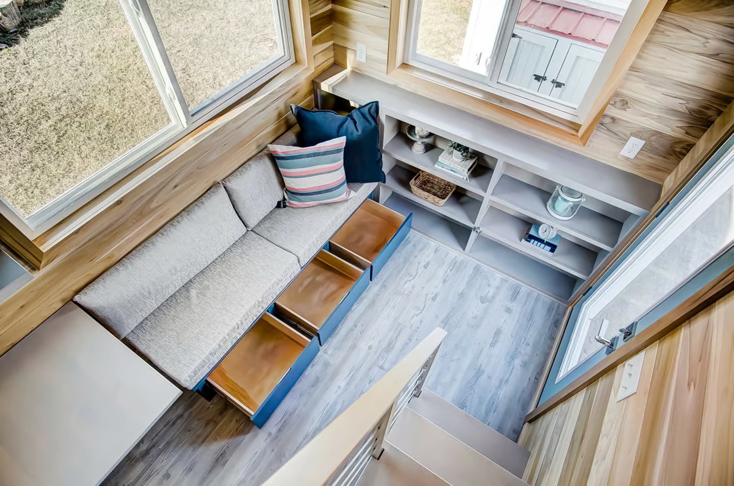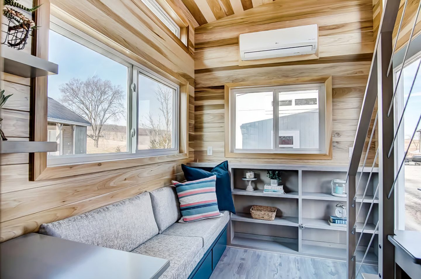 The interior of the Buxton is filled with abundant natural light, thanks to its generous glazing. It boasts poplar tongue-and-groove paneling and vinyl flooring throughout. Upon entering, visitors find themselves in the living room, where a sofa bed sleeps two individuals and incorporates convenient integrated storage space. Additionally, there are shelves and a bookcase for further organization. A mini-split air conditioning unit ensures a comfortable temperature within the living room.
