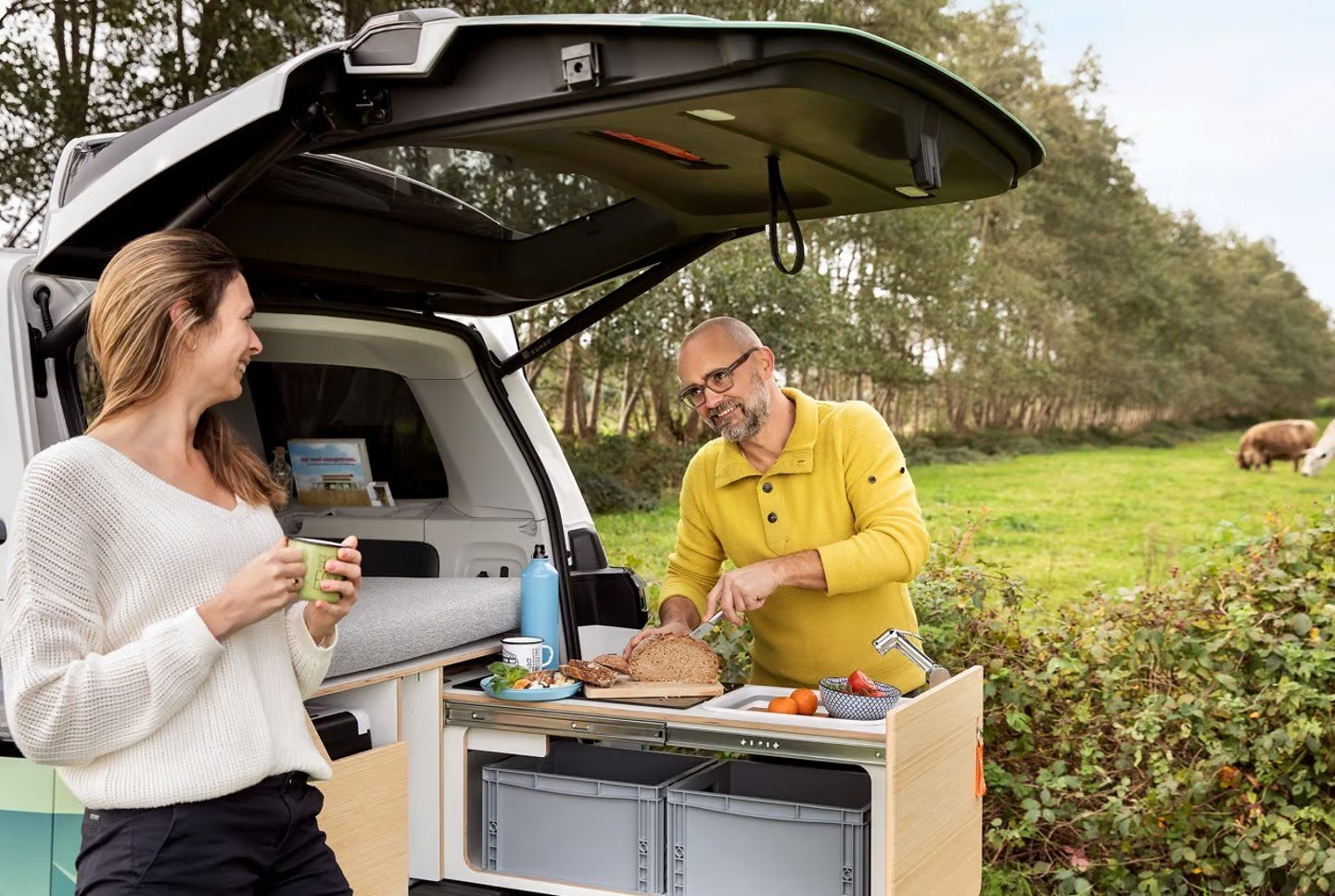 The Tonke Buzz Module kit, cleverly tucked away in the tailgate area, maintains five factory seats for everyday driving while transforming into a propane-free, all-electric mini-camping haven. A spacious double bed spans the cabin’s width, offering a cozy retreat, complemented by a bidirectional kitchen slide for convenient indoor and outdoor cooking.