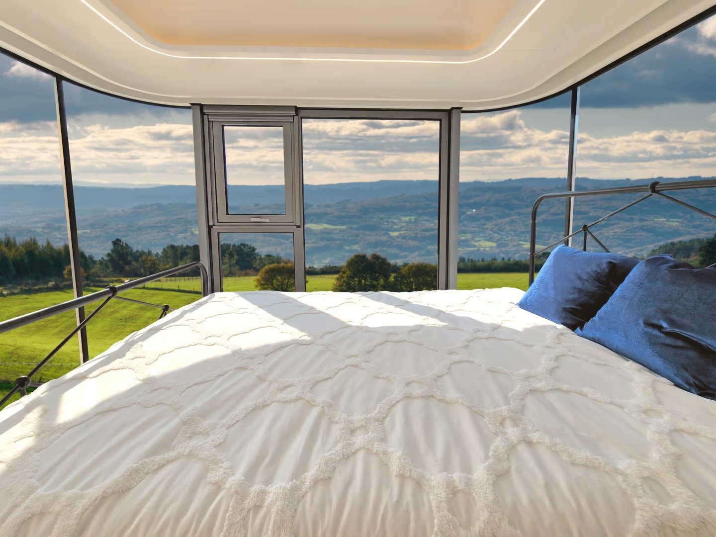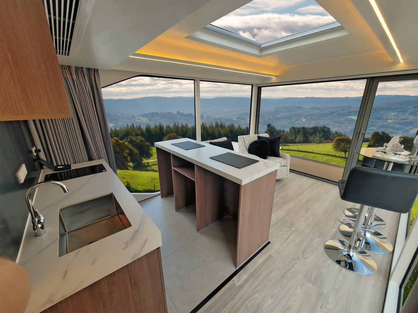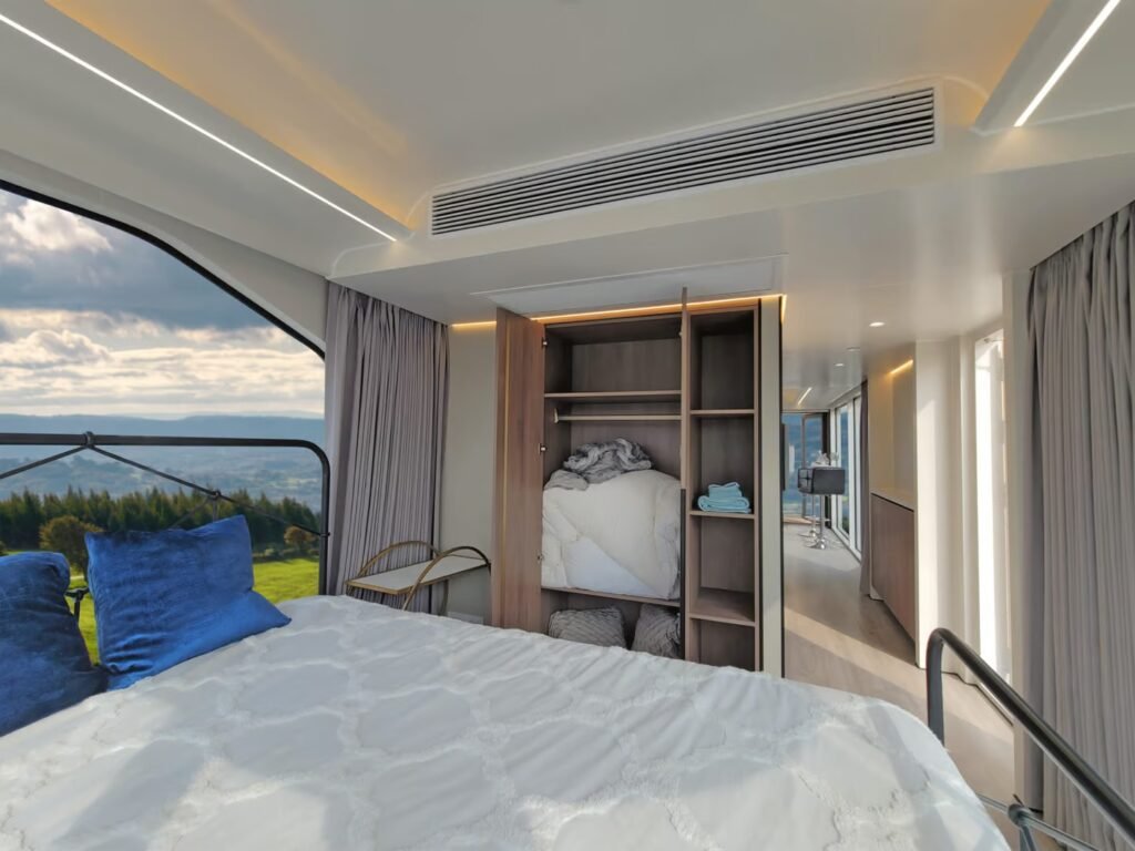 The bedroom accommodates a standard queen bed, offering a rare luxury in tiny homes. While storage space is modest, the panoramic windows ensure natural light and stunning 360-degree views, creating an airy and open atmosphere.