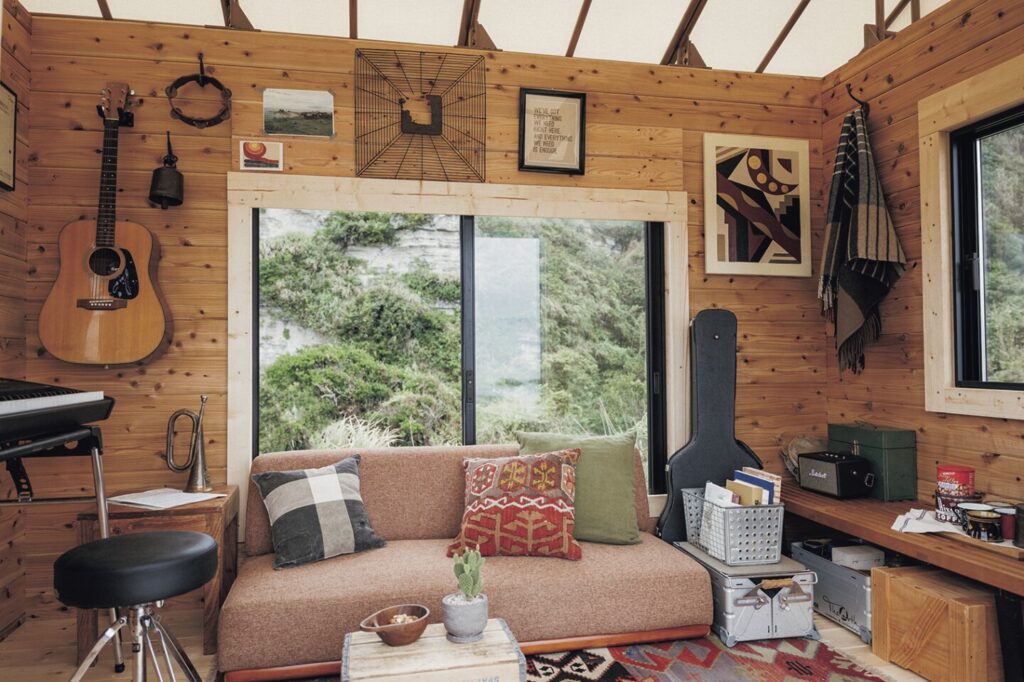 Inside the cabin there is sofa, storage space, musical instruments, some scattered boxes and other furniture.