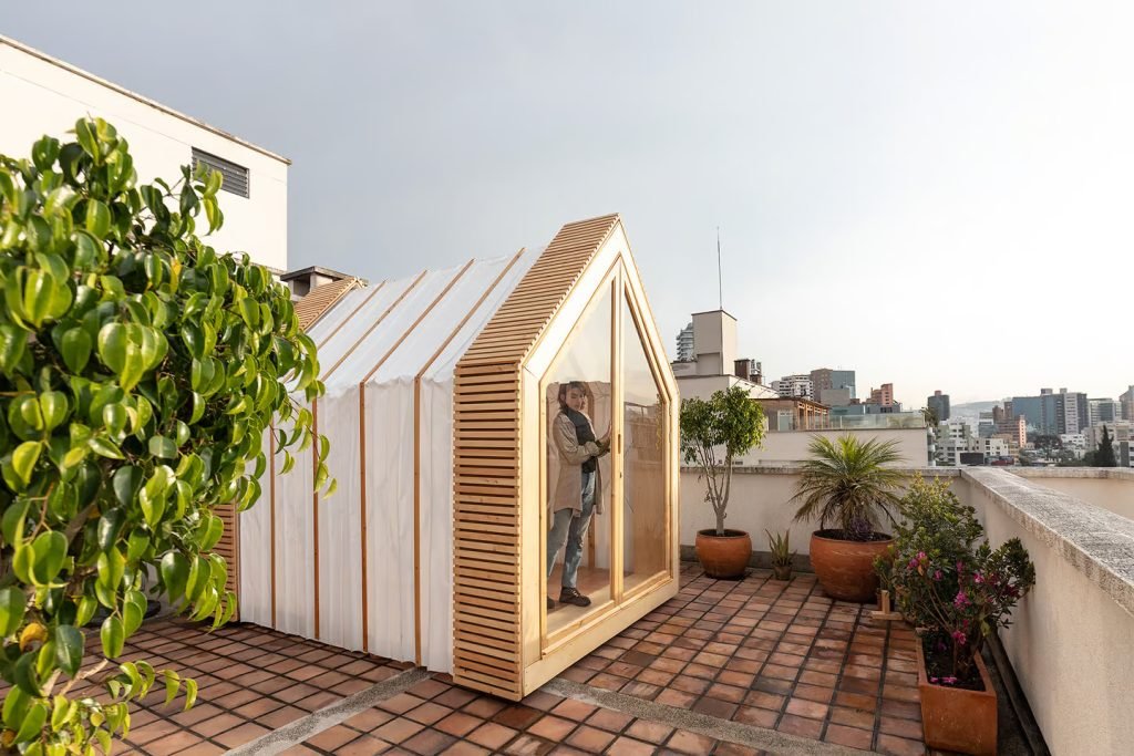 This particular prototype model is situated as a two-person office on a rooftop terrace in Quito. There are two chairs, a desk area, drawers, a shelf, and a tiny cooking area with a concealed sink. There is also enough for a printer. It includes water and electrical hookups as well, although the team claims that an off-the-grid configuration is also viable.