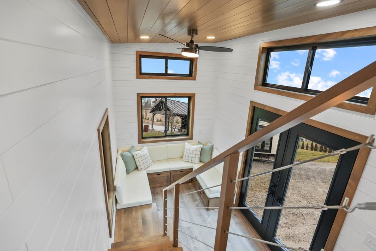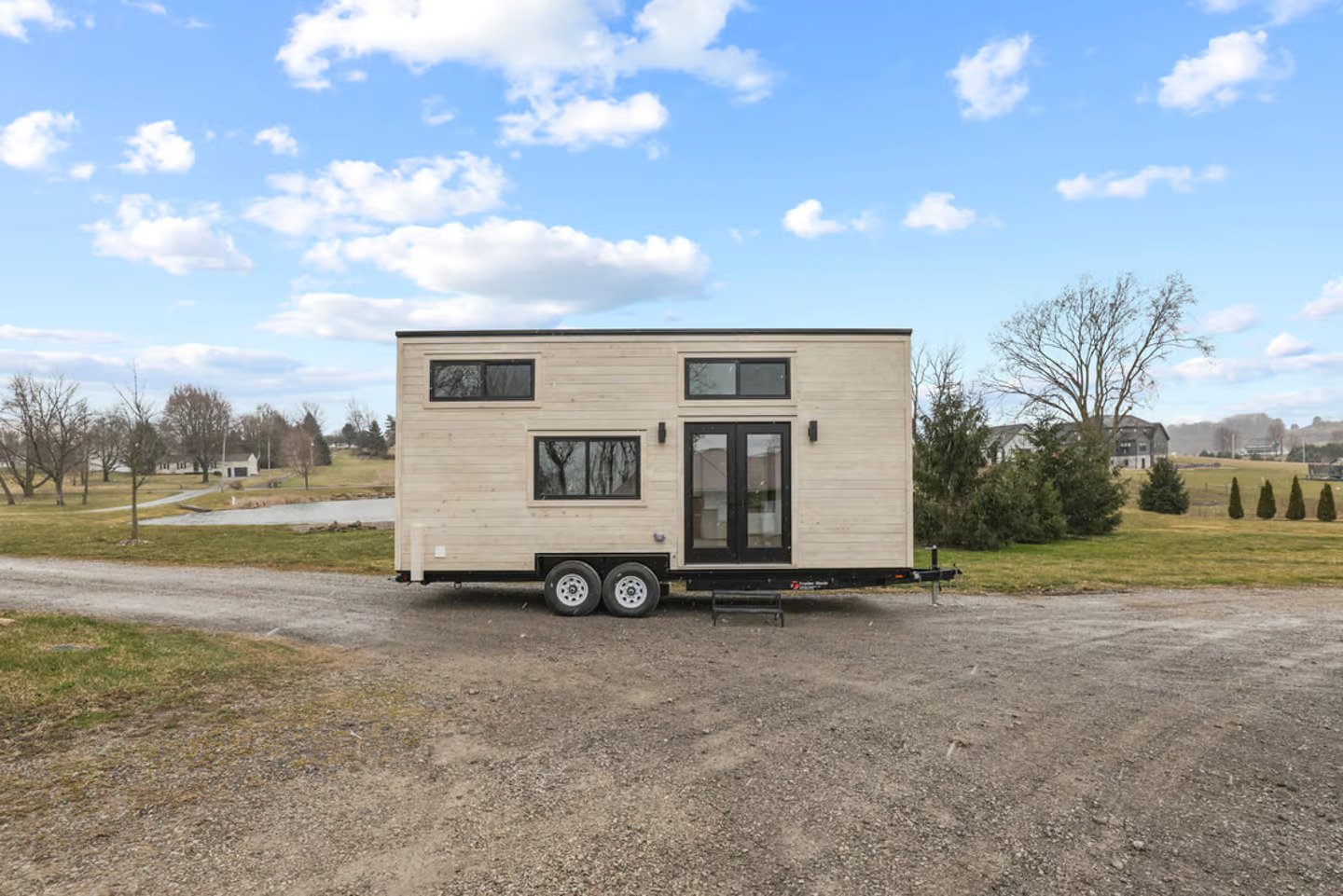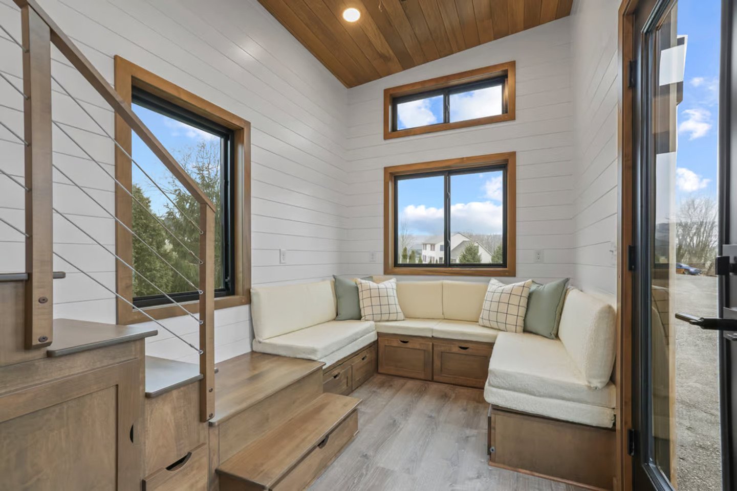 Modern Small Living designed the Coastal Modern, which is based on a double-axle trailer. It has a steel roof, cedar siding, and vinyl flooring inside. The walls are tongue and groove poplar.