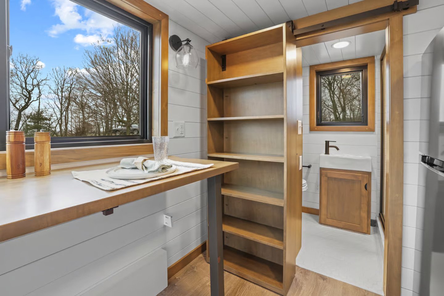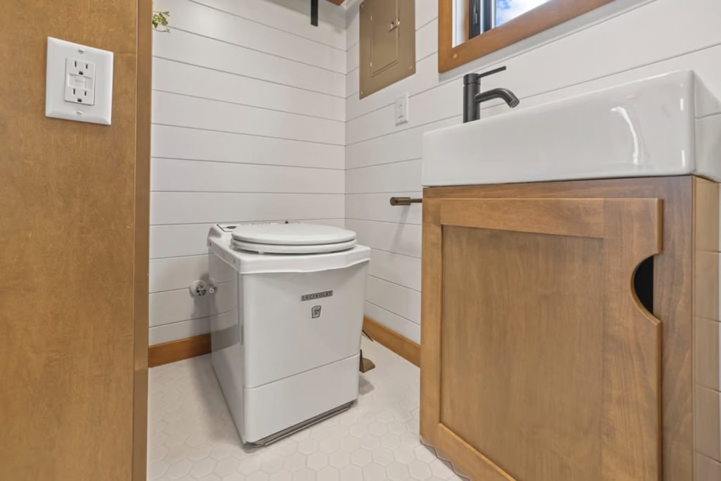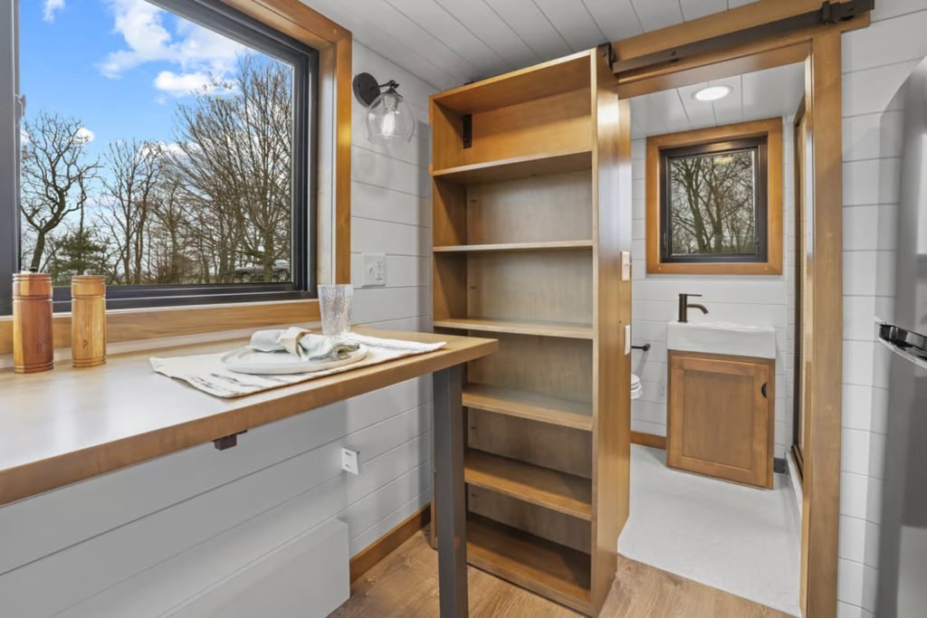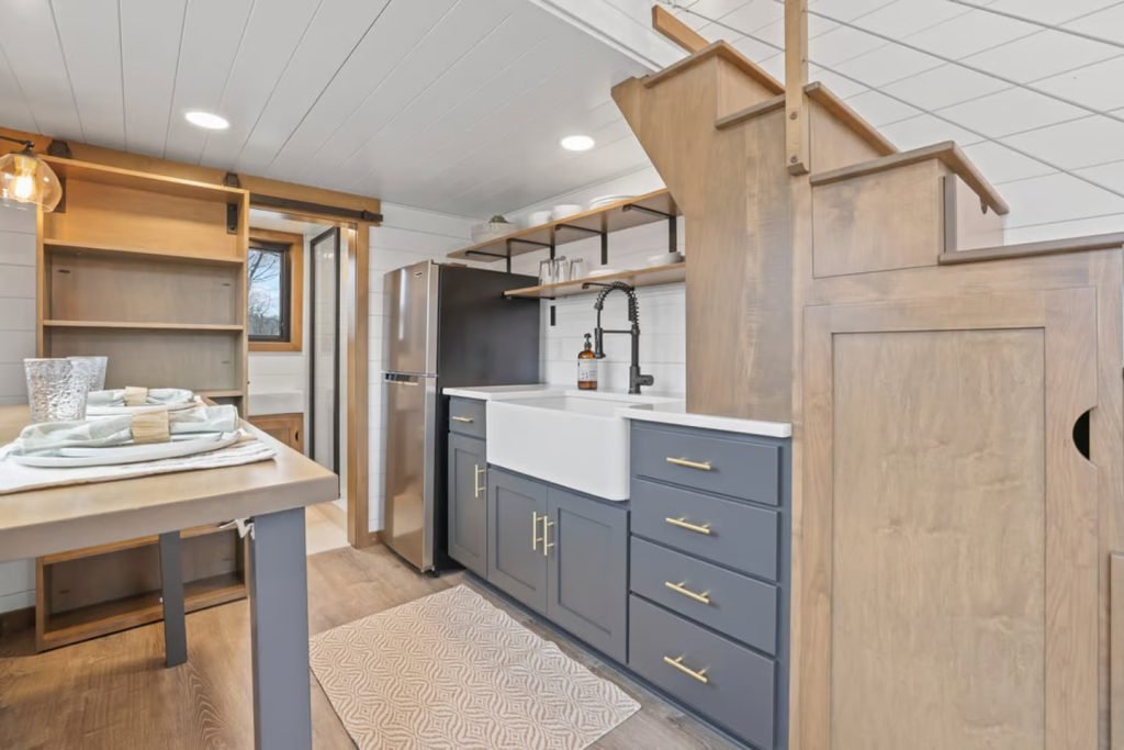 The kitchen is next to the living room. Since it will be used as a guest house, it doesn’t need a fully functional kitchen, thus it is on the simpler side for a North American tiny house (there isn’t an oven, for example). It has a refrigerator/freezer, farmhouse-style sink, and a few stackable appliances. There is also a useful table that can be folded away if more floor space is required and serves as both a workspace and an eating table.