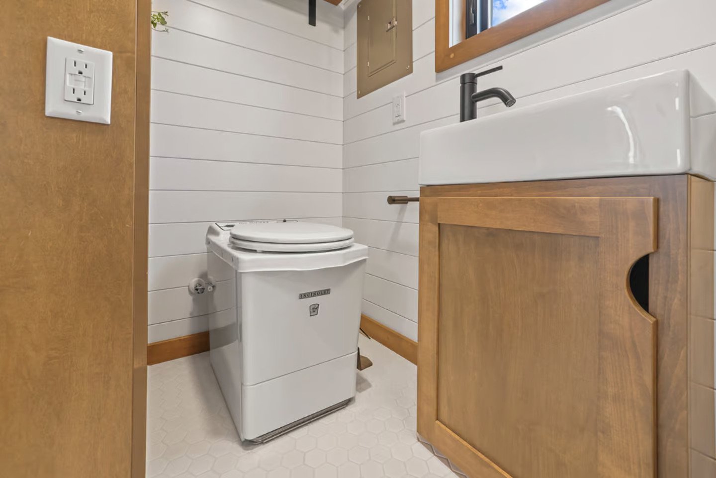 The kitchen is next to the toilet. It is accessed by a sliding bookcase rather than a sliding door, offering a little bit more storage space. The lavatory is equipped with a shower, a sink, and an incinerating toilet, which, as its name implies, burns waste to get rid of it.