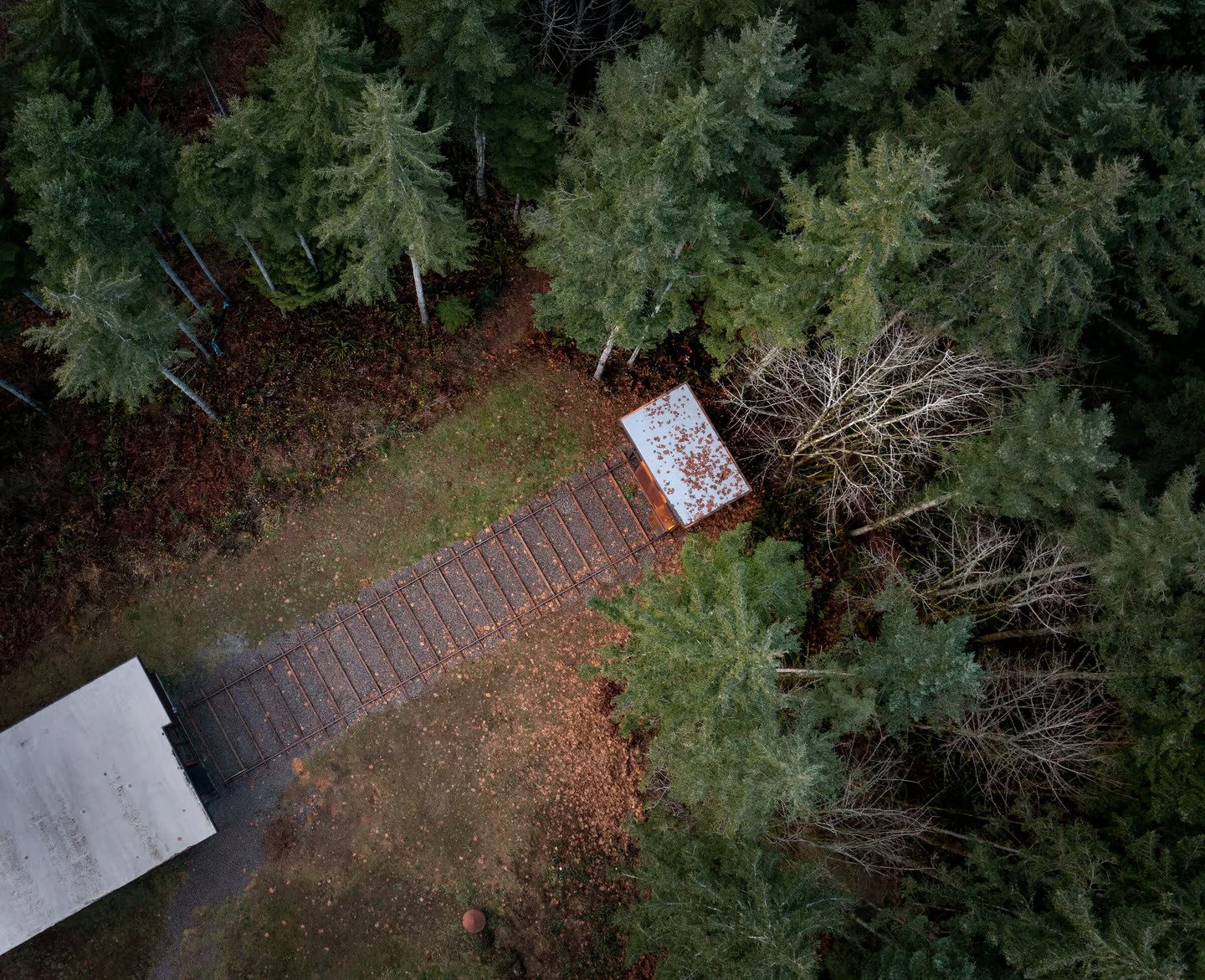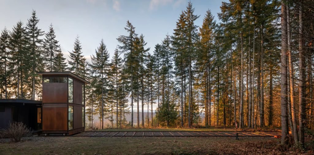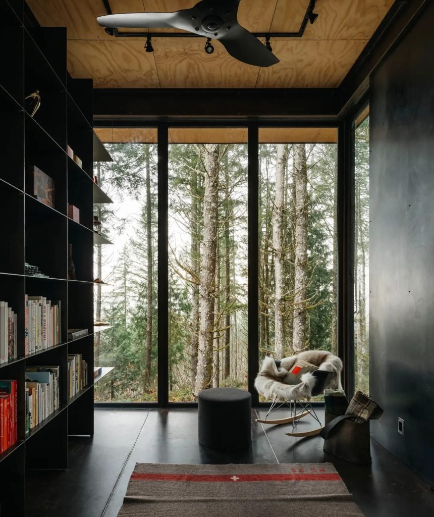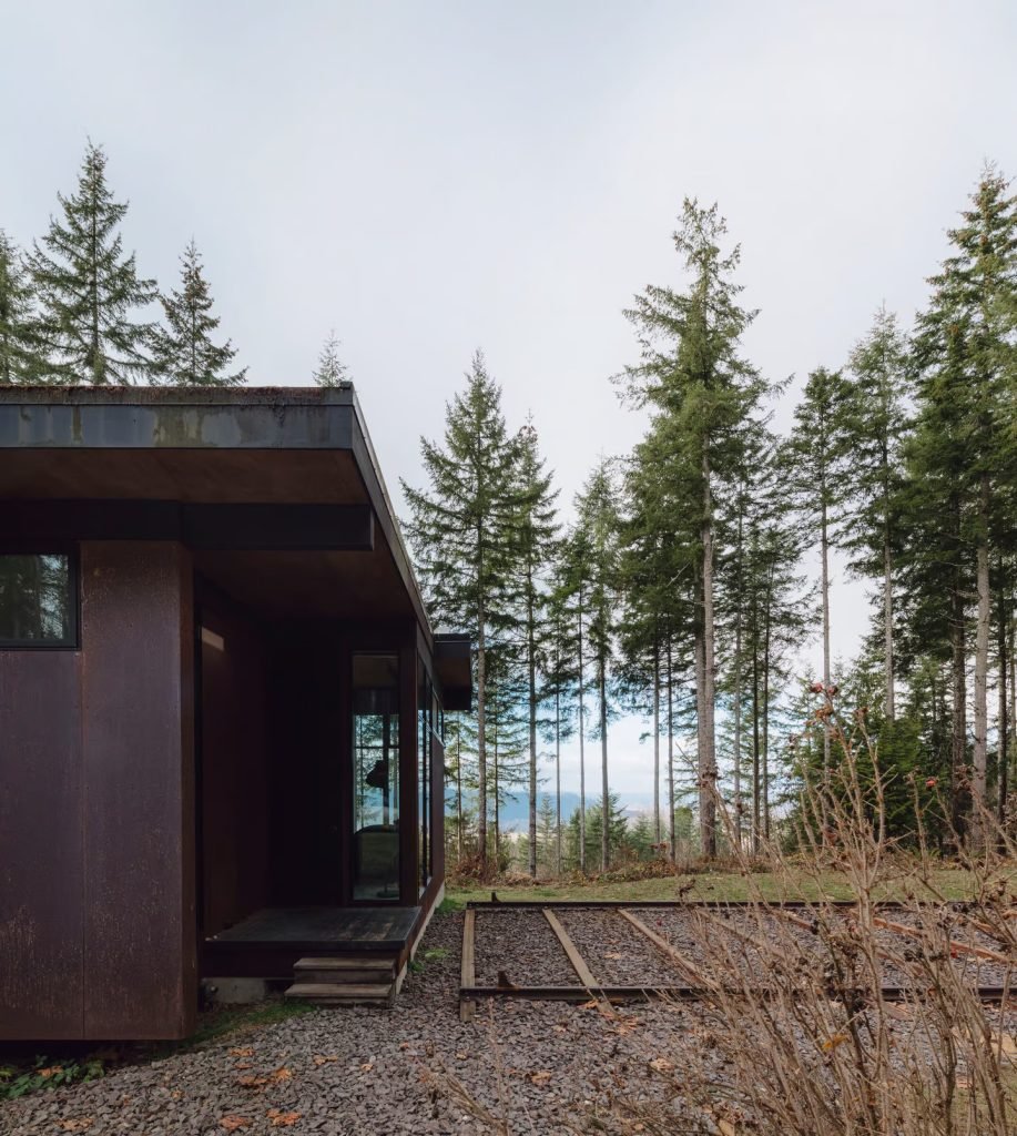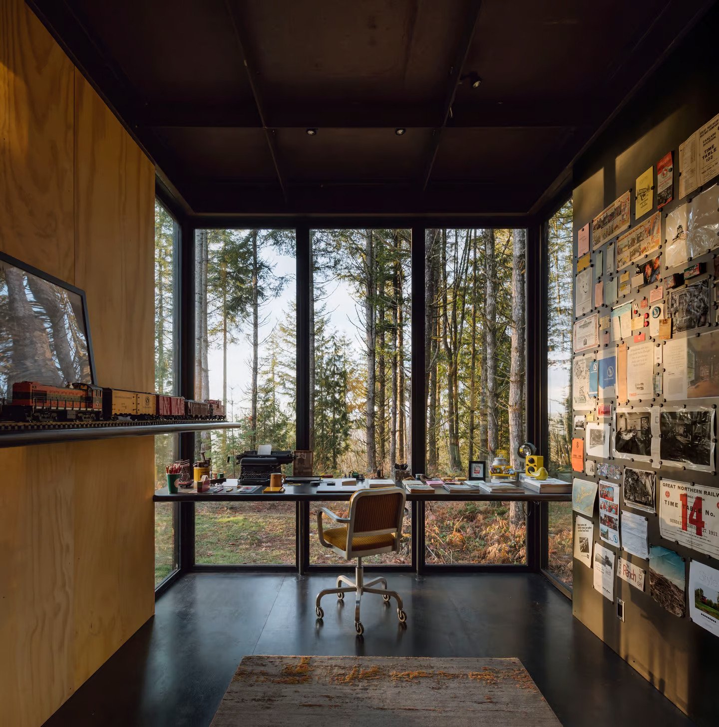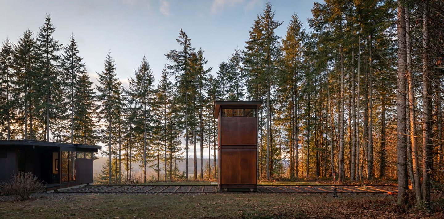 The attention to detail is apparent with the use of a vintage control panel from a Burlington Northern locomotive to operate the studio. This train-like office provides a unique separation between work and home life and is situated in a forest near Carnation, Washington.