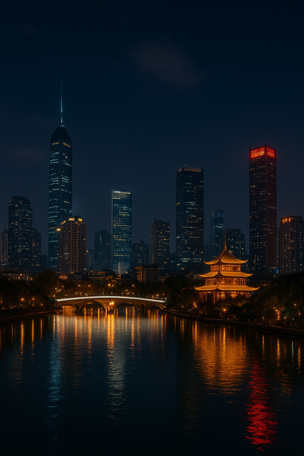 The world’s largest single building (Global Center) glows blue, while the Jin River reflects neon.