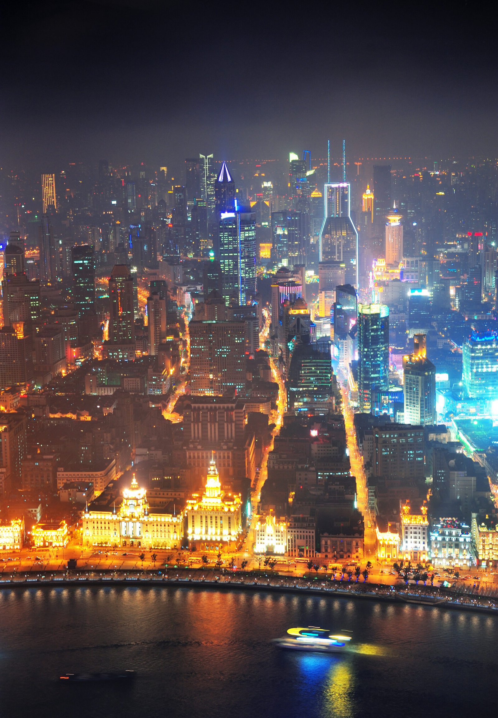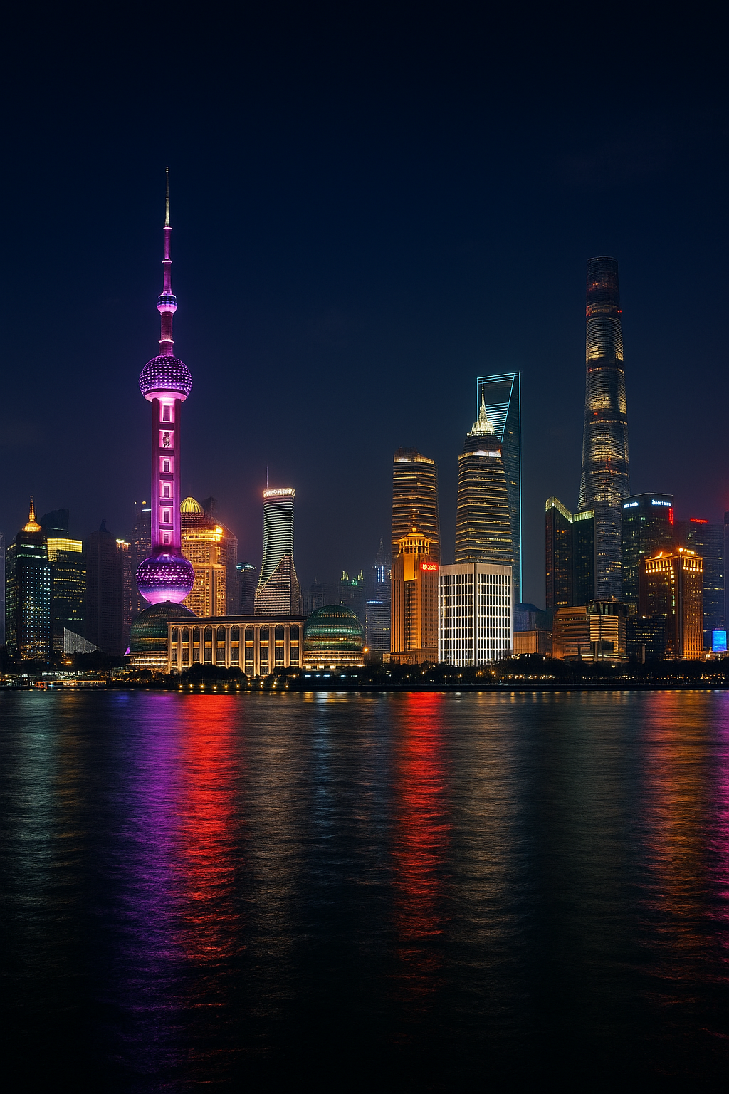 No city defines Chinese cities at night better than Shanghai. The historic Bund glows in warm yellow opposite Pudong’s sci-fi skyline: Oriental Pearl Tower, Shanghai Tower (632 m), Shanghai World Financial Center, and Jin Mao Tower all explode in synchronized LED colors.