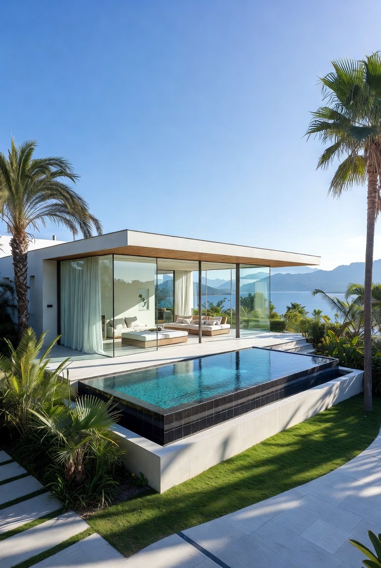 1. Infinity Pool Overlooking the Lake: Install an edge-less pool that visually merges with the water, enhancing your lakeside villa house with LED lighting and heated stone surrounds for ultimate relaxation.