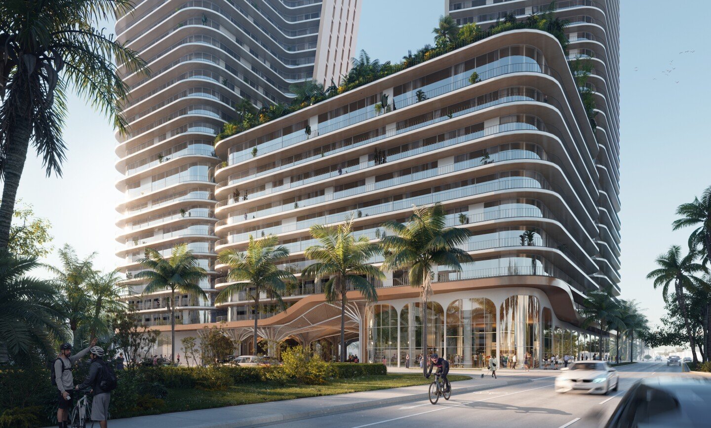 “The building design features two towers strategically positioned at the two highly visible corners of the site: one at the northwest corner of West Broward Boulevard and Southwest 4th Avenue and one at the southeast corner of Nugent Avenue,” explains ODA. “As the south tower rises it angles towards the north tower, connecting the top 11 floors. This dramatic bridged massing creates a unique dynamic form and a symbolic gateway. It not only takes advantage of the best views the site has to offer but also creates an elegantly sculpted icon in the City’s skyline. The void created between the towers lends it a compelling appearance and offers the practical benefit of view corridors through the building. The towers feature continuous balconies with panoramic views of the City and bring in ample natural light and air for all units.”