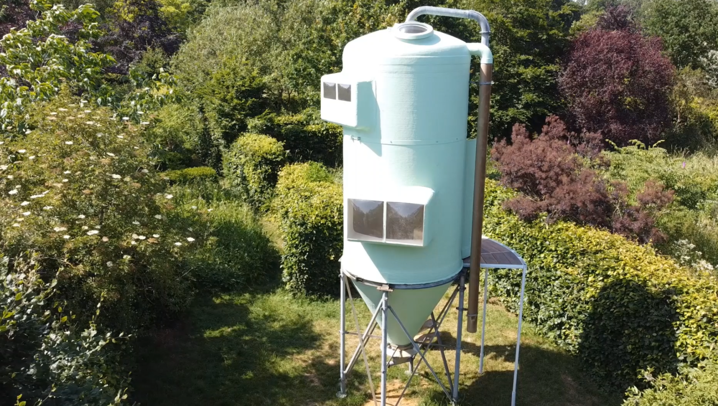With a height of roughly 7 m, painted Silo has double doors cut into with added window. It has a lookup point on top with a clear hatch. Habitants can access using some external steps. Although its very compact inside due to the lack of floorspace yet the first floor features some storage space and a ladder leads to the bedroom with a 2 x 1.2 m (6.5 x 4 ft) bed.