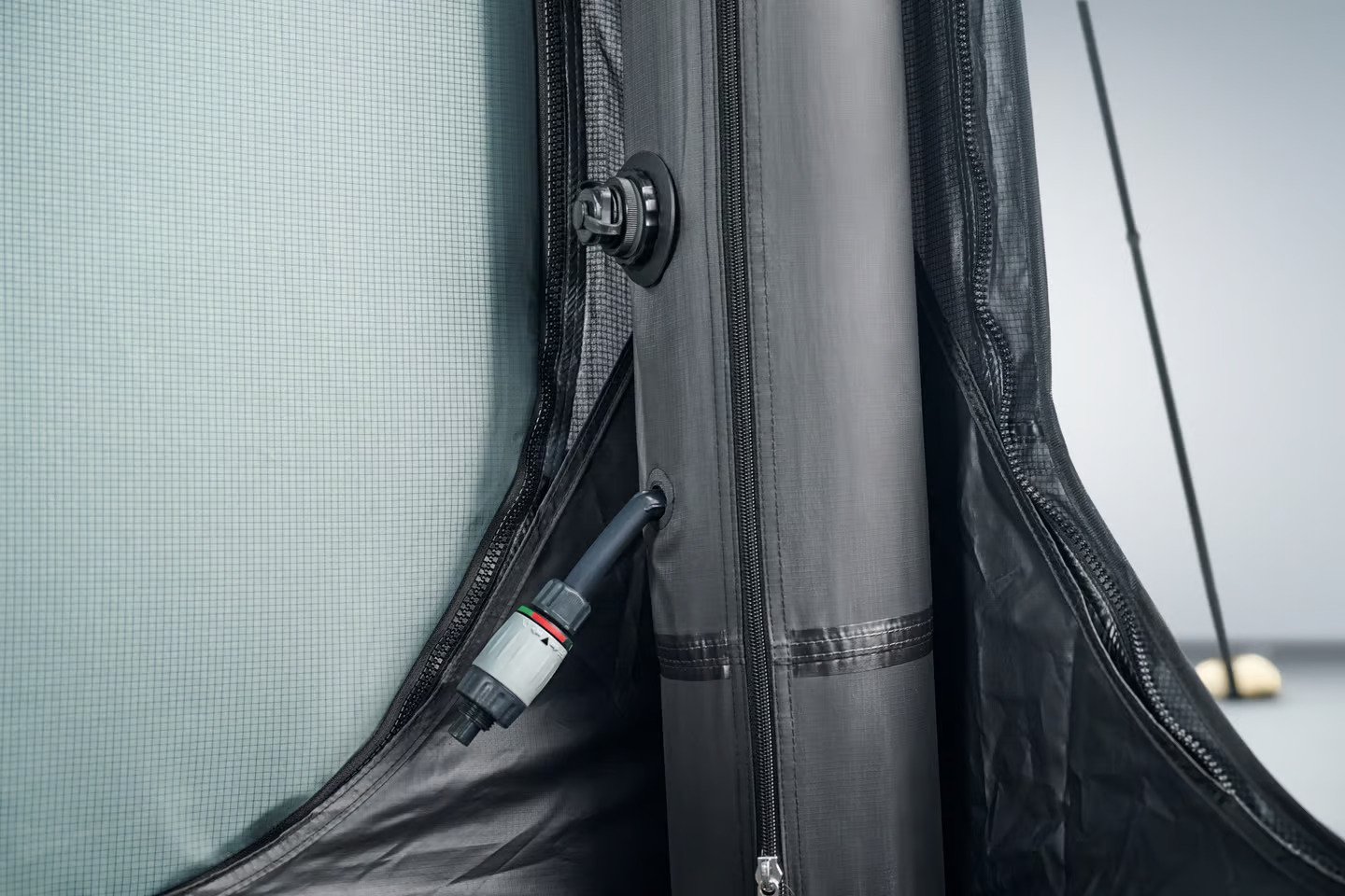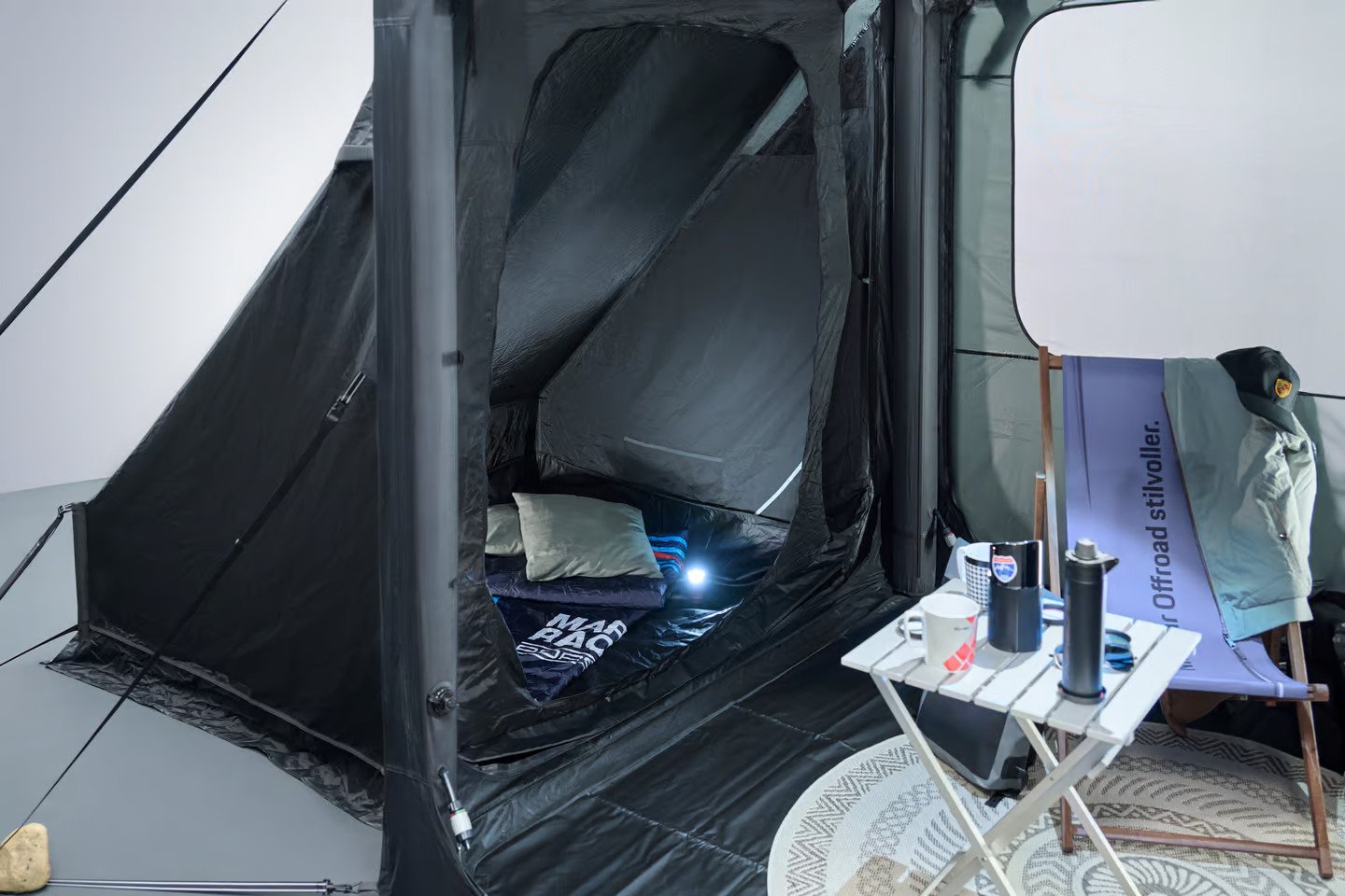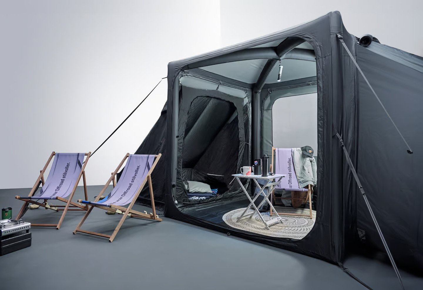 Inflatable Air Frame: The Porsche Canopy Tent uses an air frame system, eliminating the need for poles. A quick hand pump inflates the tent for easy setup.