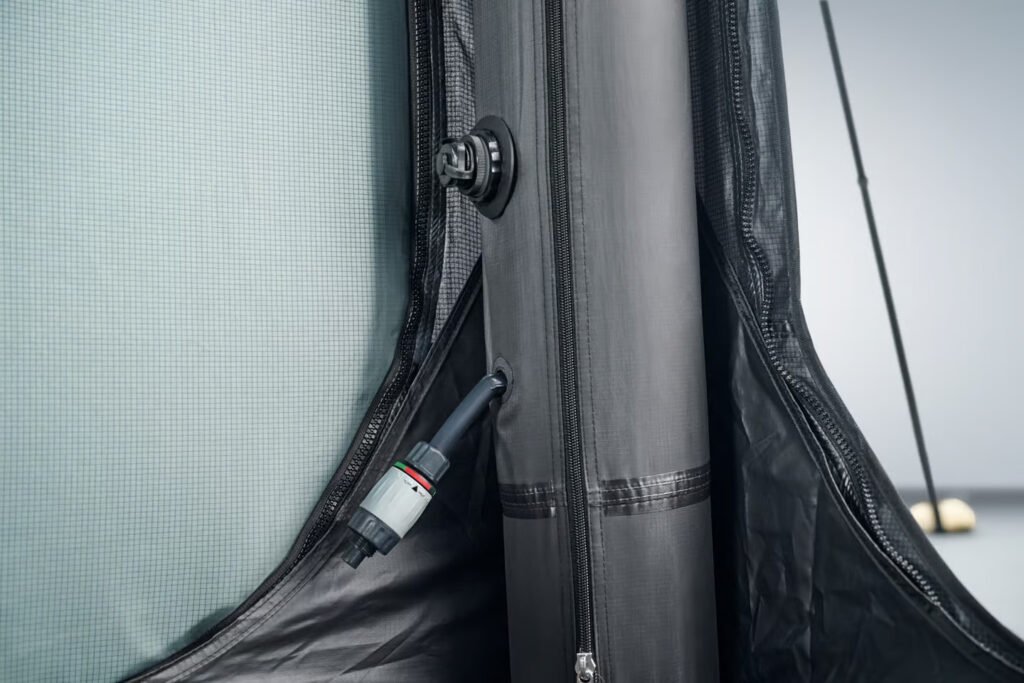 The Porsche Canopy Tent is an inflatable, tailgate-attached shelter that offers a seamless camping experience for Porsche owners. Built to accommodate up to six people, the tent boasts a 7.5 x 7.5-ft (2.3 x 2.3-m) floor space, offering ample room for relaxation or sleeping. Unlike traditional tents, this Canopy tent uses an air frame that inflates via a hand pump and central valve, giving it a sturdy yet flexible structure.
