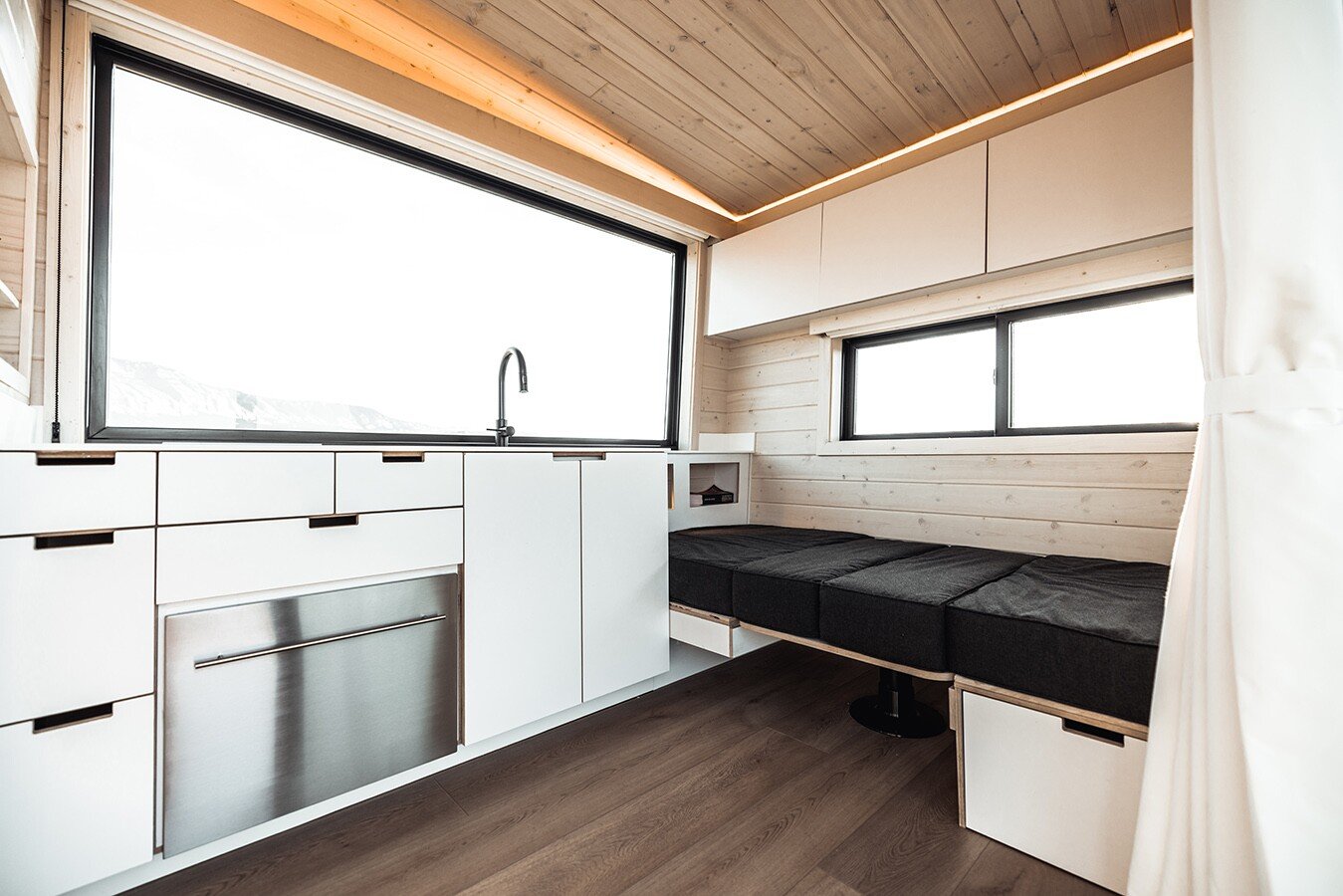 Guests can get into the living room / kitchen, that features a sink, a two-burner propane stove, a hot air microwave, a fridge-freezer, custom cabinets and a dishwasher, which is still a relative luxury in a small house. . There is also an adjoining dining table and a sofa that can be used as a work desk too. It has integrated storage, a TV holder and becomes a double bed for guests. The nearby bathroom features a shower, shelving, toilet, a vanity sink and some cabinetry.