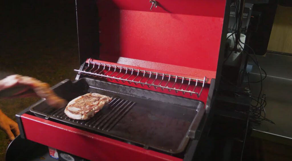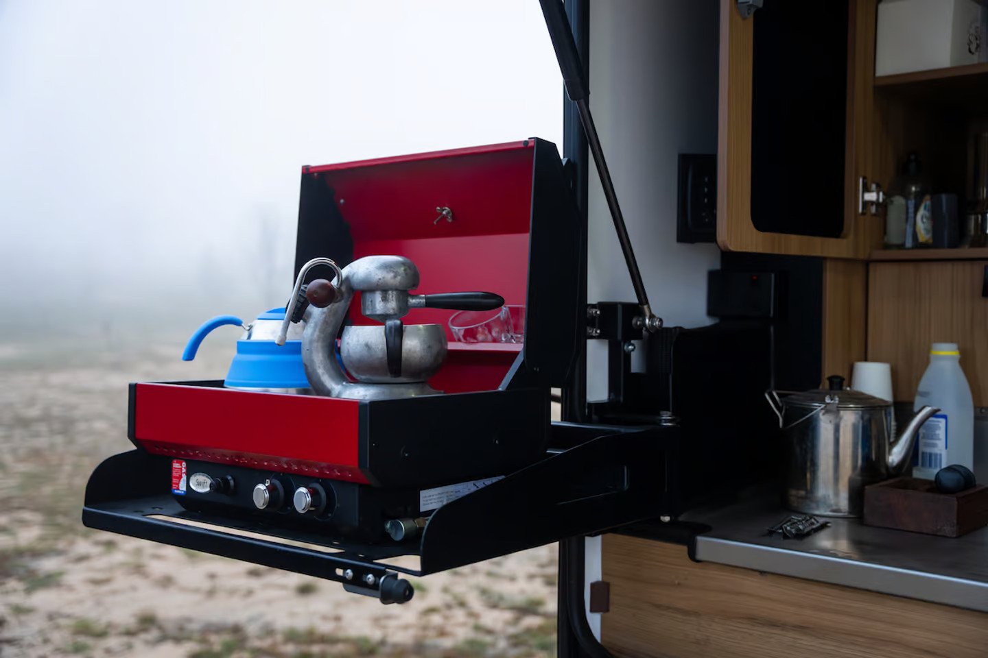 The worktop of the galley features a tilt-up design, giving you easy access to a storage compartment beneath. Here, you’ll find a 120-Ah+ lithium battery, an optional diesel water heater, and additional kitchen storage. The updated cooking setup includes a Swift grill, replacing the former Weber grill. The Swift grill features a sunken ribbed grill/griddle top that can be removed to reveal gas burners below, effectively turning it into a dual-burner stove. This unit also includes a vegetable roasting rack and works like an oven with the lid closed, offering versatile cooking options.