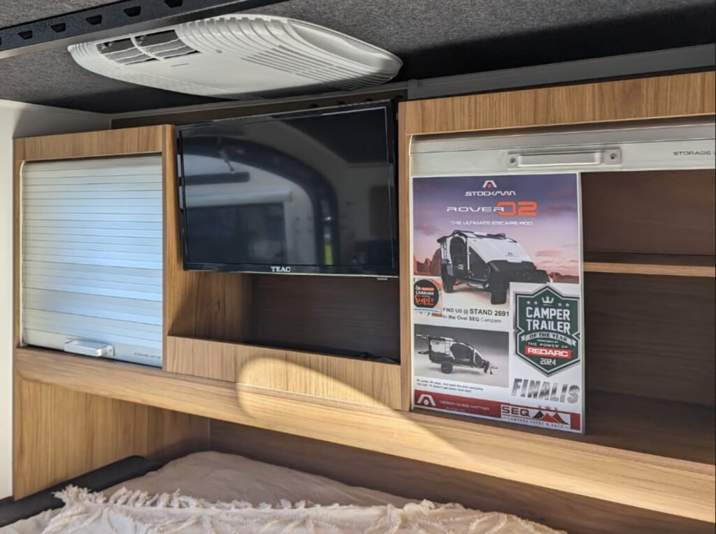 Inside the Rover 02, the queen-size inner-spring mattress ensures a comfortable night’s sleep, while two cushioned headboards make for excellent lounging. New storage cupboards have been added above the cushions, and an optional 24-inch smart TV can be installed. For those seeking additional comfort, an optional air conditioner and diesel heater are available.