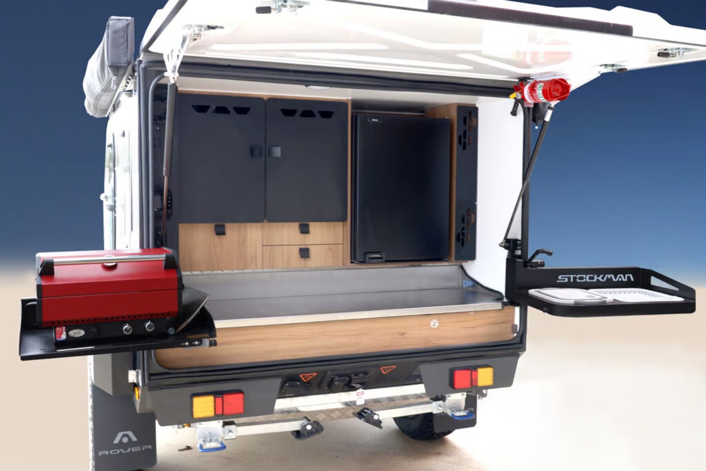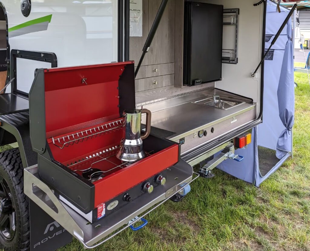 In its second generation, the Rover has been upgraded with several impressive features. A major addition is the multipurpose swivel griddle, ideal for quick cooking on the go. The Redarc power distribution system offers enhanced energy management, while an integrated wine rack brings a touch of sophistication to your camping experience. Despite maintaining its rugged charm, the Rover 02 has refined its features, making it a top contender in the camper trailer market.