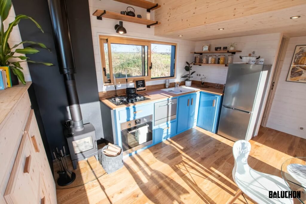 Inside, the layout maximizes space and light, with the kitchen occupying the center of the home. This well-appointed kitchen includes an oven, a three-burner propane stove, a fridge freezer, and even a rare dishwasher in a French tiny house. A small wood-burning stove offers heating, ensuring warmth throughout the space.