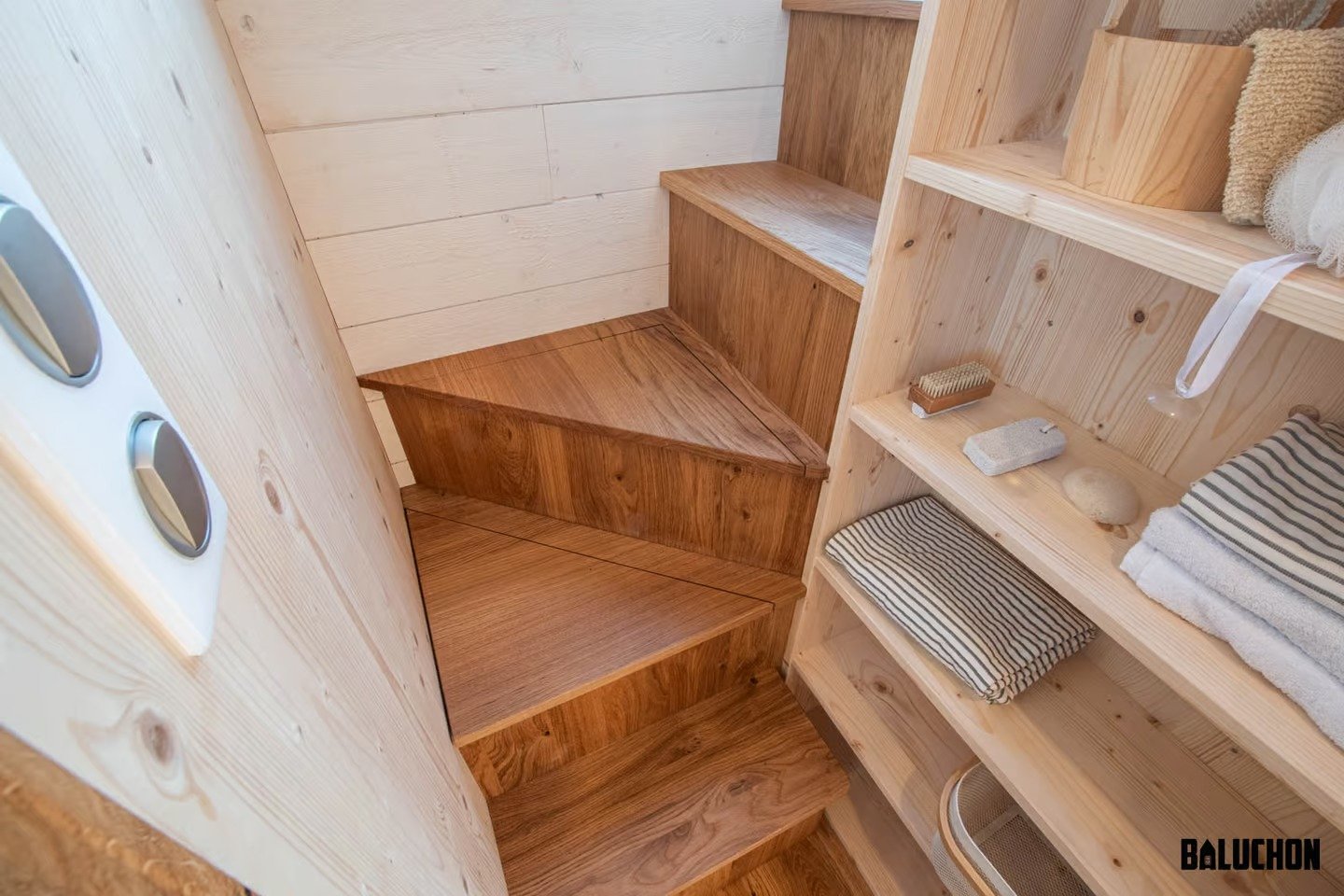 The Ivy Tiny House by French firm Baluchon challenges traditional tiny house layouts with its spacious, towable home design and unique “upside-down” layout. Unlike smaller models like the Hytta, this tiny house is built on a double-axle trailer, with a length of 8 m (26 ft), offering more space than the typical 6 m (20 ft) found in many French tiny homes. While it is larger than most French counterparts, it remains compact compared to some North American tiny houses, such as the Purple Manor.