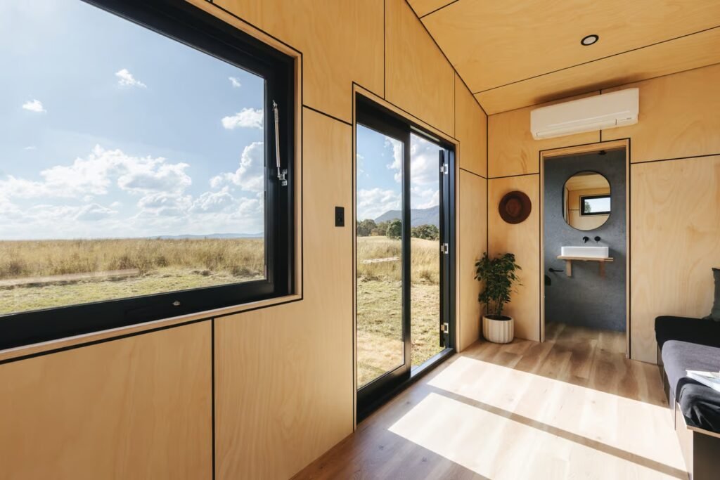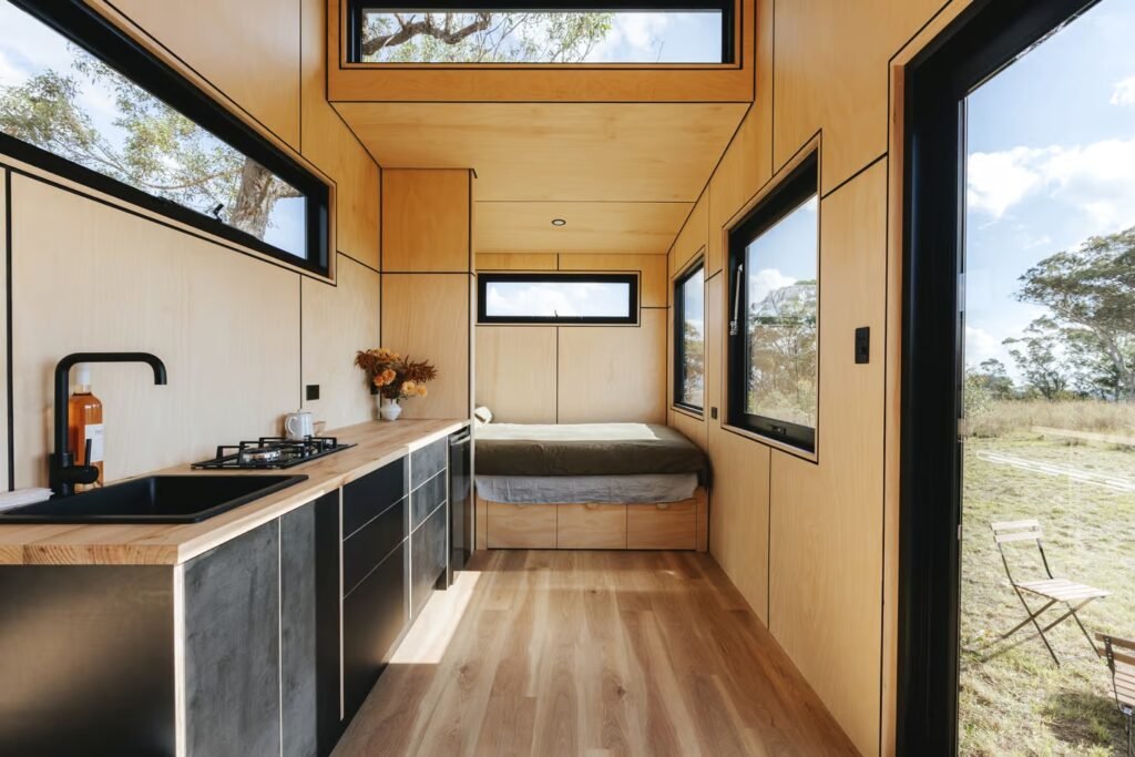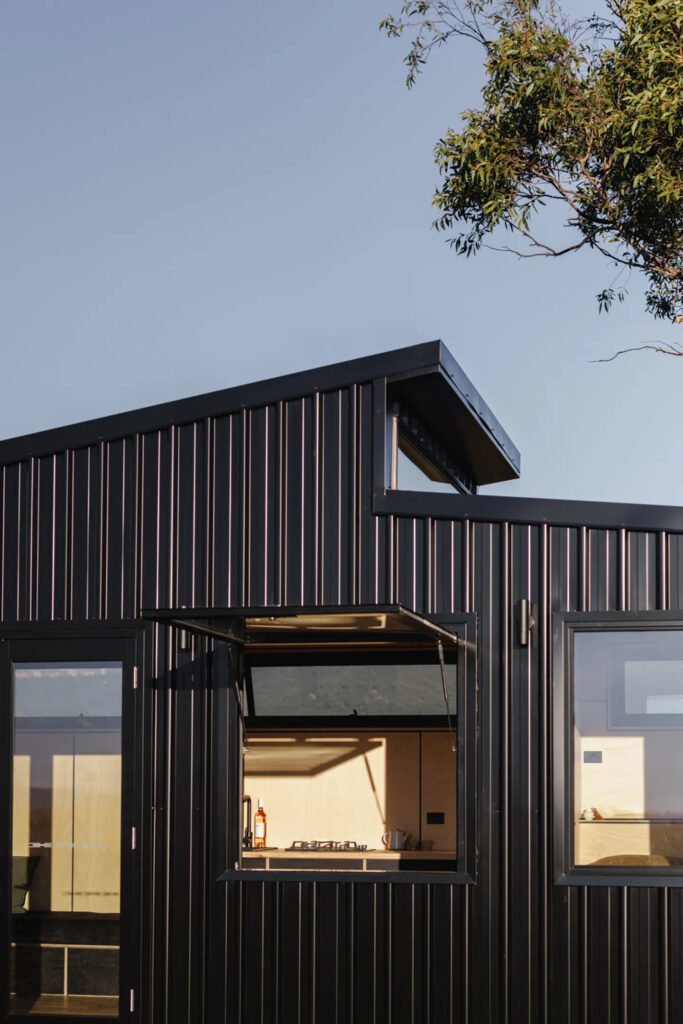 The Sun Valley model is built on a triple-axle trailer and measures 7.2 meters (23.7 feet) in length. Its distinctive sloping roof and sleek black metal exterior set it apart from the typical tiny house designs. The extensive use of glazing allows natural daylight to flood the interior, creating a bright and airy atmosphere despite the home’s modest 15.4 square meters (166 square feet) of living space.