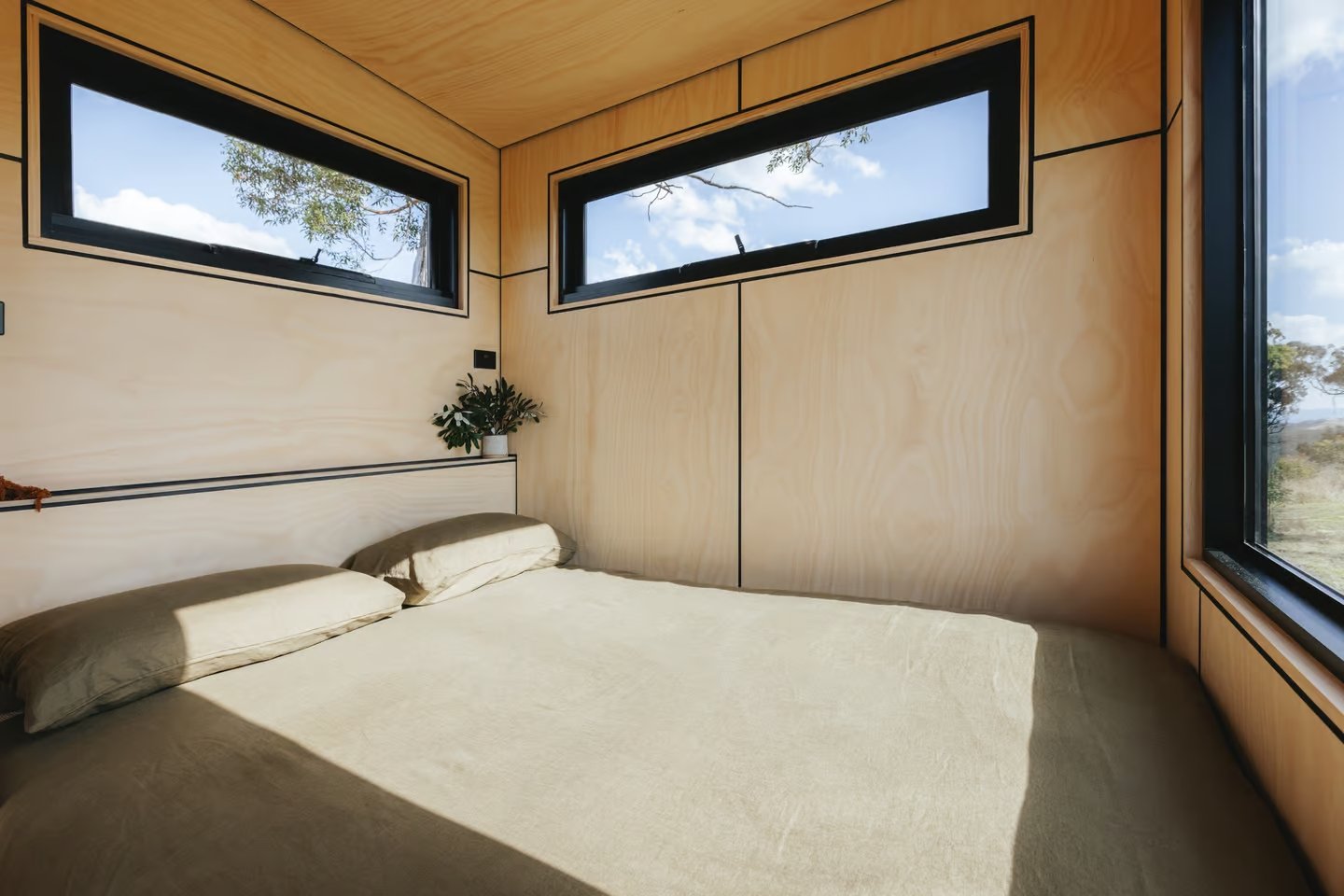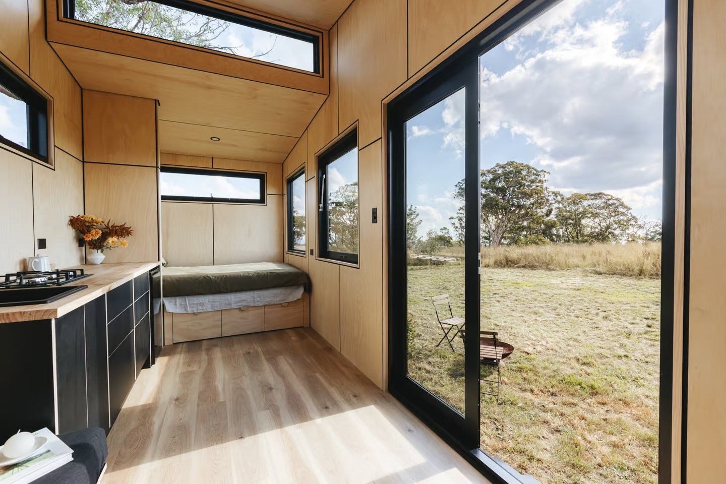 Adjacent to the living area is a compact yet efficient kitchen equipped with a sink, a two-burner propane stove, a small fridge, and cabinetry. The kitchen seamlessly connects to the bedroom, which features a double bed with built-in storage and ample glazing for natural light. The ground-floor placement of the bedroom ensures generous headroom, offering comfort and ease compared to traditional loft-based designs.