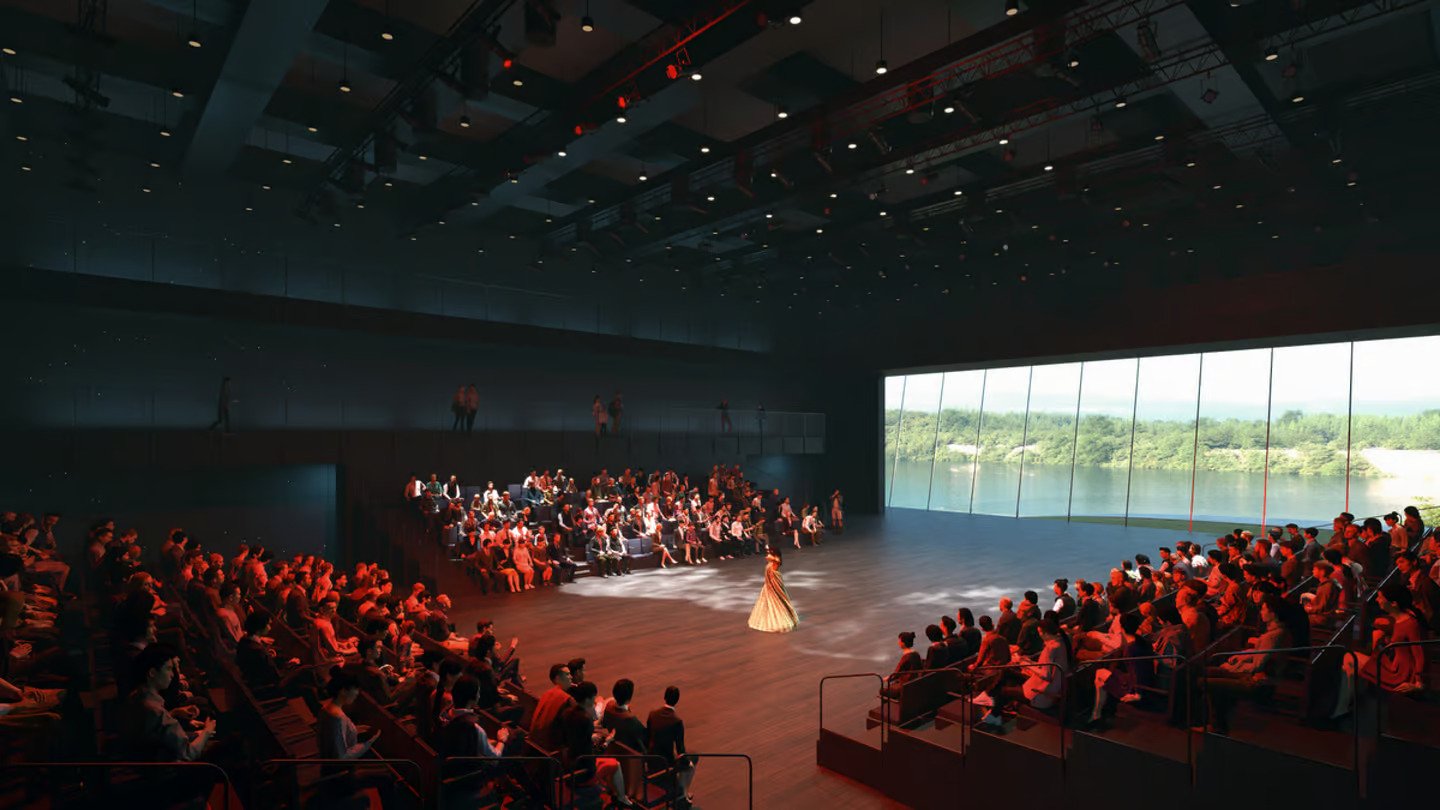 The interior will include a 1,600-seat grand theater, a 1,200-seat concert hall, and a smaller 400-seat black-box theater, as well as educational facilities, event and exhibition spaces, rehearsal rooms, coffee shops, restaurants, and observation decks.